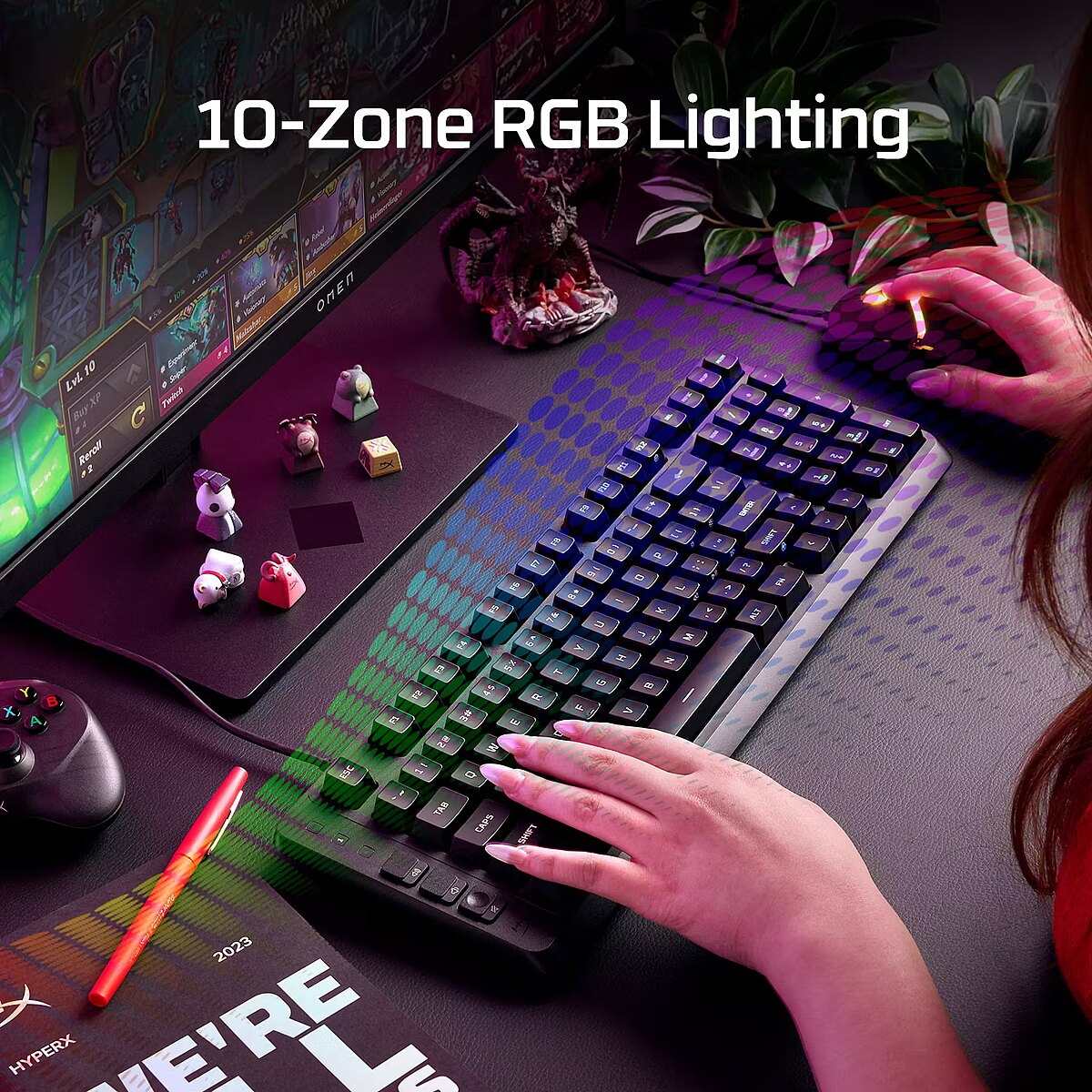 LongDesc - The Eve of GamingThe HyperX Eve 1800 Gaming Keyboard is a compact gaming keyboard that gets you started right. With its condensed layout, you get more desk space for your mouse, microphone, and headset. Enjoy 10 zones of customizable, dynamic RGB lighting and turn your keyboard into the perfect accessory for your PC. Beyond lighting effects, this budget-friendly keyboard delivers style and performance in a sleek design with convenient media buttons. It features anti-ghosting and 12-key rollover, so your keypresses register exactly when they need to. Plus, the membrane switches deliver satisfying, cushioned keypresses that won't disturb you while you play. After all, this is the eve of your gaming adventure.