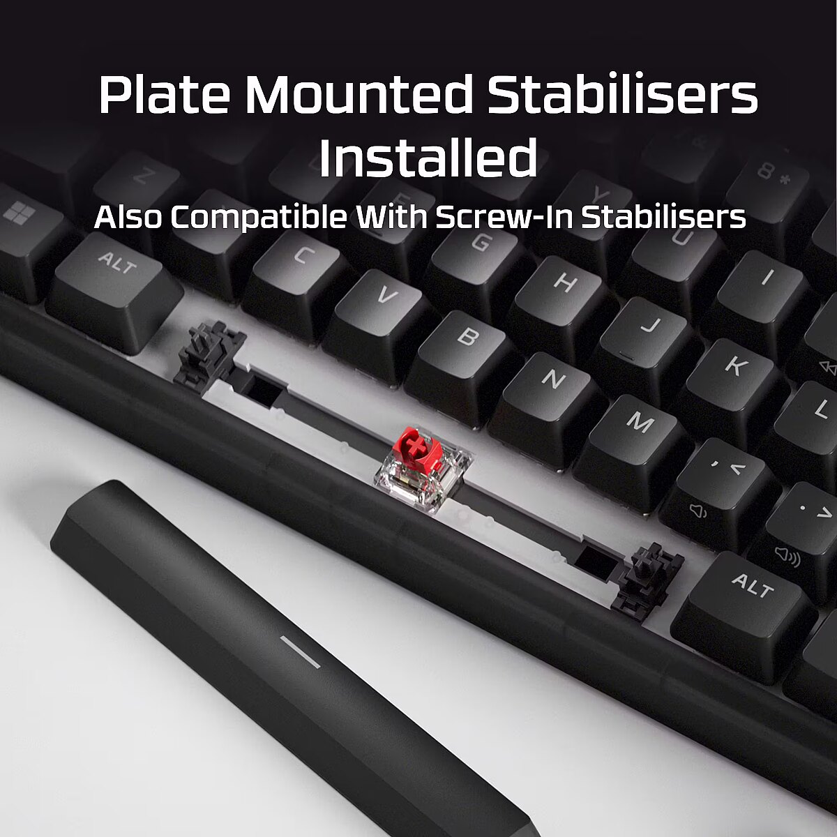 Origins 2 keyboards utilize an O-ring mount to provide a light bounce and deeper sound to each keystroke, a reverb-dampening, removable silicon weight, and Plate-mounted stabilizers to reduce wobble.