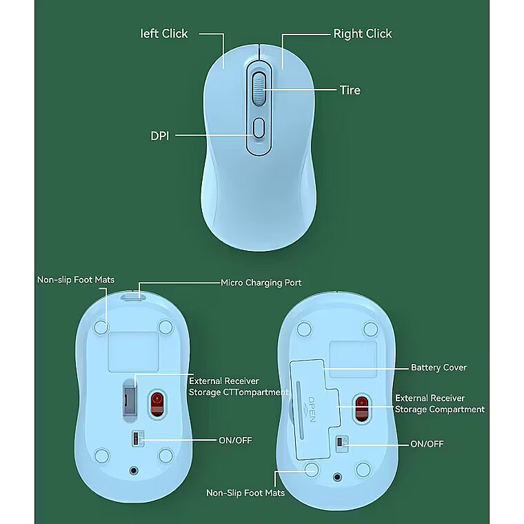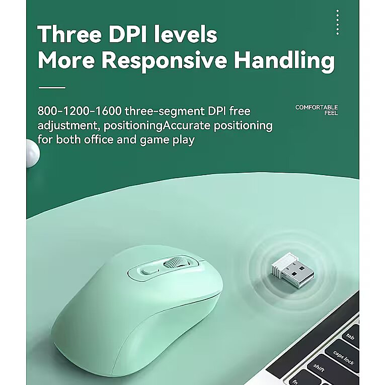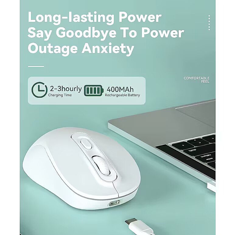 Key Features: 2.4 GHz wireless connection 4 buttons, including scroll wheel Silent click design — ideal for quiet environments Adjustable DPI: 800 / 1200 / 1600 Rechargeable via Type-C Battery capacity: 400 mAh Charging time: 2–3 hours Compatible with Windows, macOS, Linux