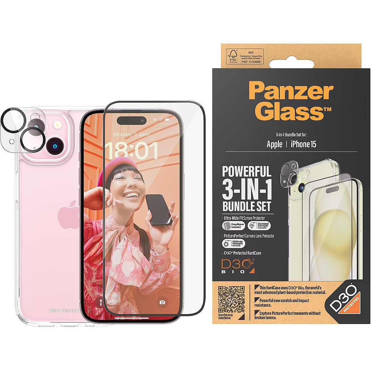 PanzerGlass 3-in-1 Pack iPhone 15, PicturePerfect Camera Lens Protector, a wireless charging compatible HardCase and an Ultra-Wide Fit Screen Protector