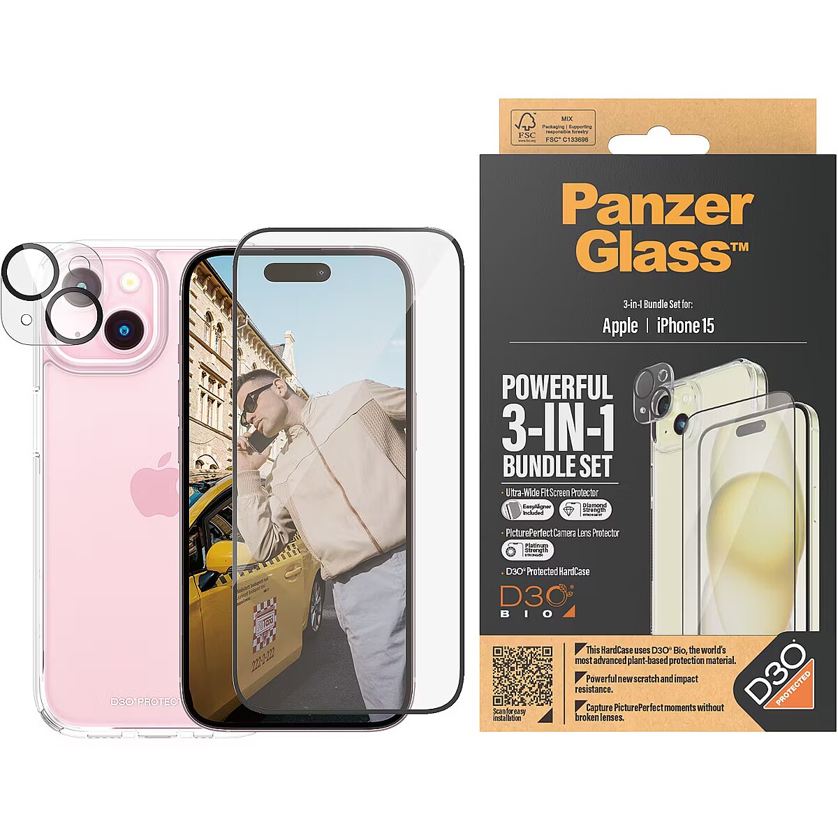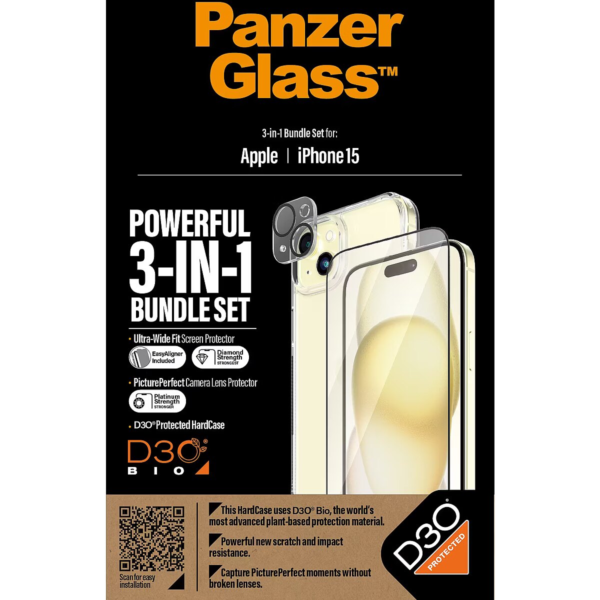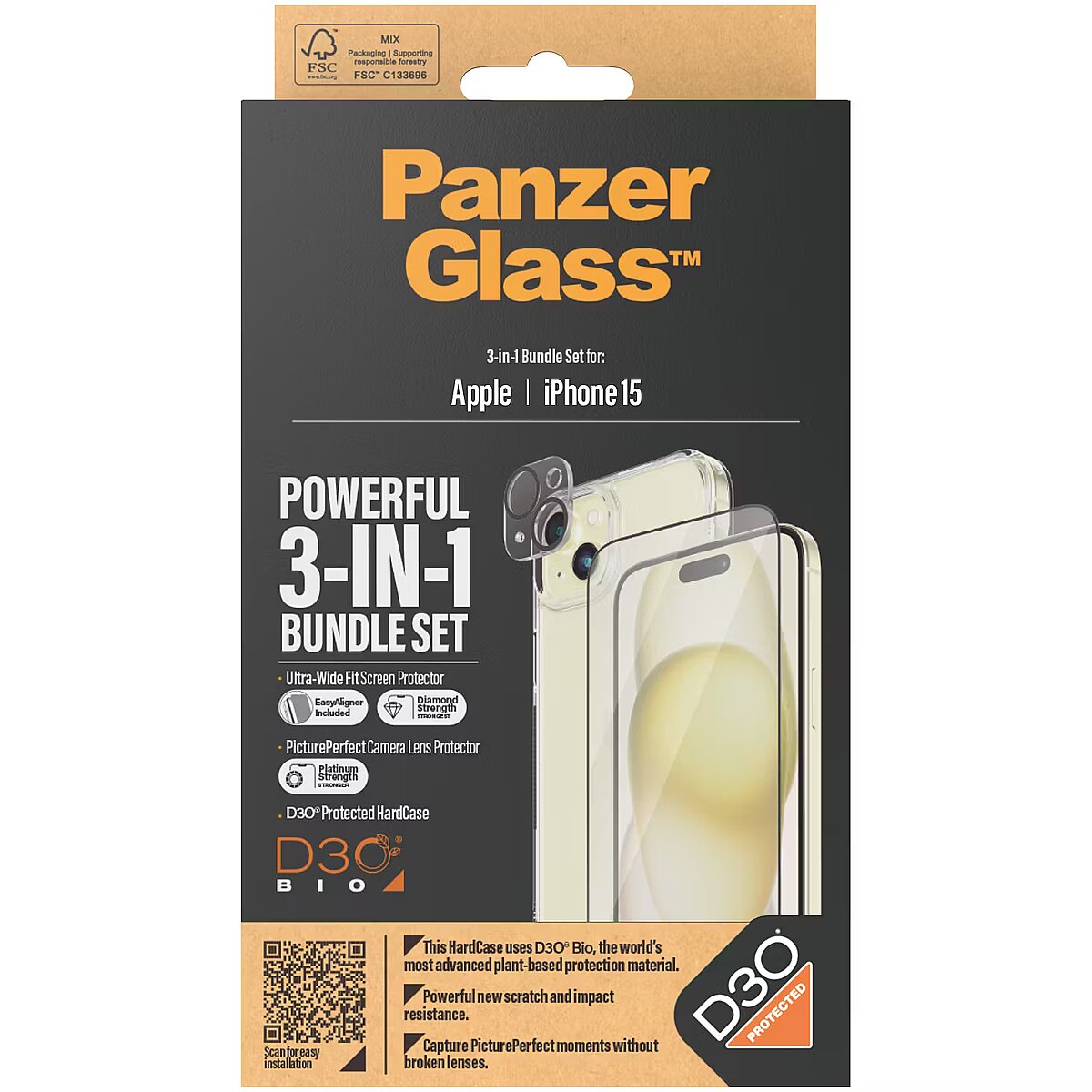 LongDesc - Want to protect your phone? I mean REALLY protect your phone? Then this 3-in-1 protection pack from PanzerGlass® is for you! Featuring a PicturePerfect Camera Lens Protector, a wireless charging compatible HardCase and an Ultra-Wide Fit Screen Protector, this pack keeps your phone safe from scratch-creating bumps against sharp-edged corners, phone-cracking falls onto stone-hard pavements and just about anything else life might throw at you. The screen protector even has a smudge-free coating that reduces traces of fingerprints and greaseThe HardCase is made with the world’s most advanced plant-based protection material, D3O® Bio, trusted to protect military elite forces and professional athletes alike. Its back is made of 100% recycled plastic, while the frame is made of plastic with 44% plant-based content. The screen protector is also tougher than tough, featuring 3x better scratch resistance. And the PicturePerfect Camera Lens Protector? Well, we don't want to brag, but it’s as strong as they get and keeps your lenses free from scratches and cracks that would leave permanent scars on all future photos.The 360-degree protection pack prolongs the lifetime of your phone so that one day you can pass it on to someone else who will love it just as much as you do. This is one way of working toward a more sustainable future. Another is to use less packaging: For this pack, we have managed to reduce the paper packaging by approximately 58%* compared to previous packs. This product comes in a recyclable FSC™-certified box.Installation is also easy. Just apply the camera lens protector, click on the HardCase and use the EasyAligner to mount the screen protector. To make it even easier, we’ve included step-by-step instructions as well as a QR code for quick access to our online how-to video. And once everything is installed, you’ll never again fear the sight of your phone tumbling to the ground. This may not happen, but if it does, you’ll regret not having clicked “add to cart”.*Estimated by comparing the paper weight with our 2022 packaging.