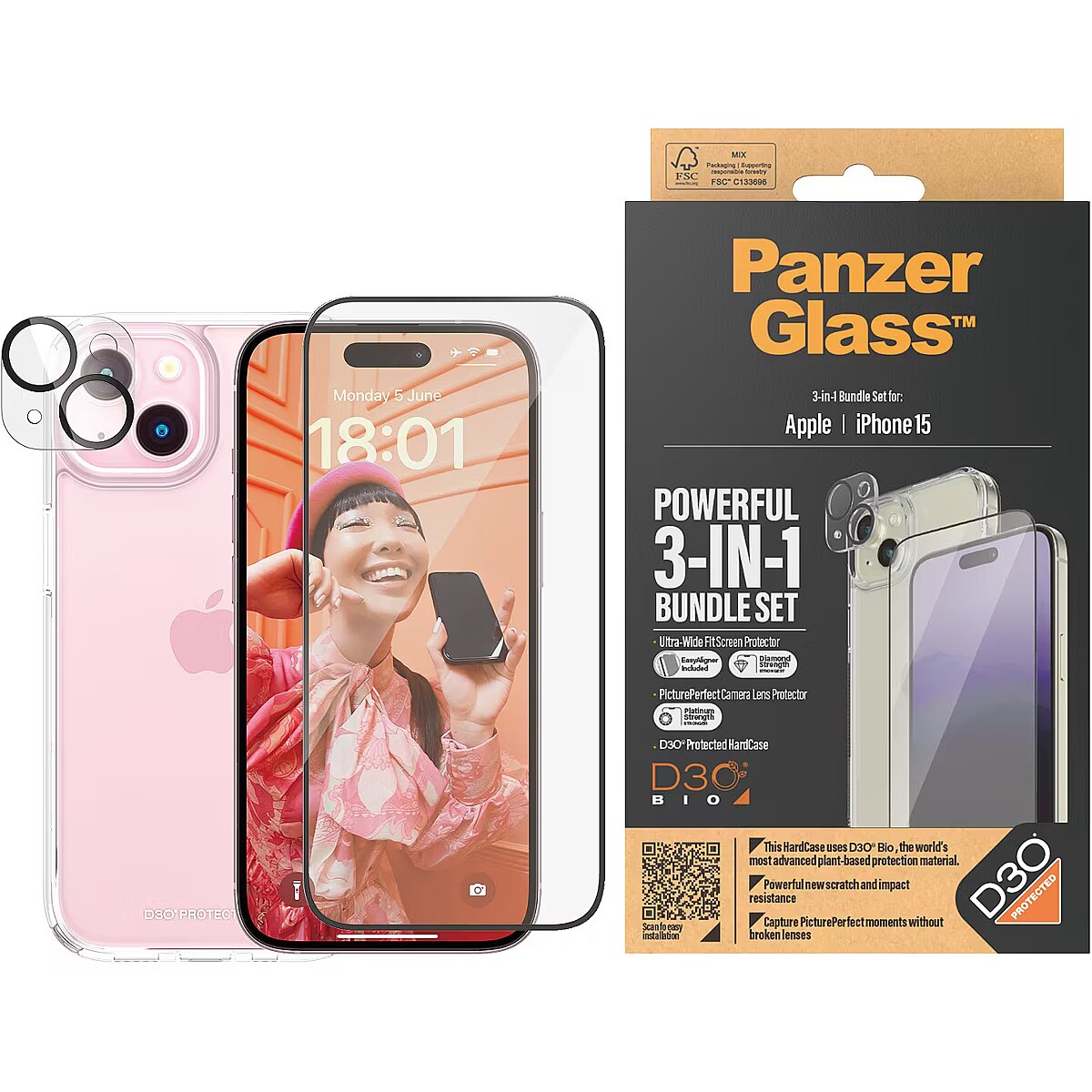 ShortSummaryDescription - PanzerGlass ® 3-in-1 Bundle iPhone 15, Apple, Apple - iPhone 15, Dry application, Shock resistant, Transparent, 1 pc(s)