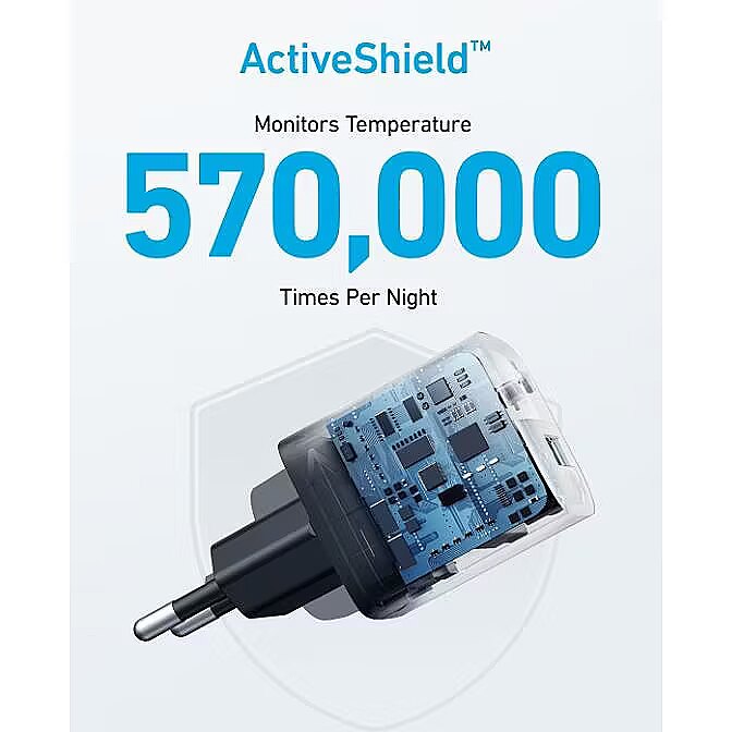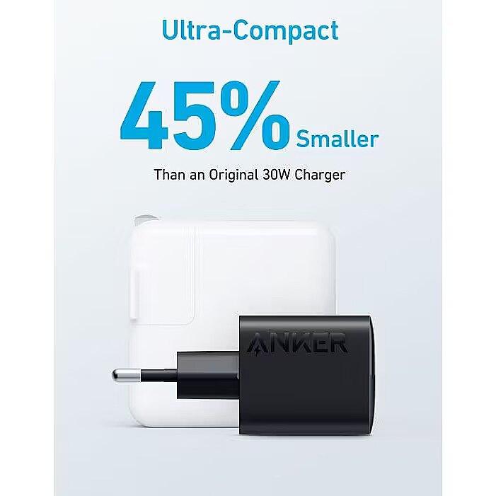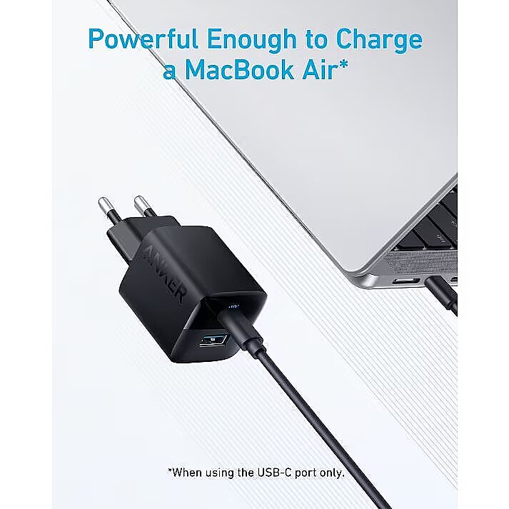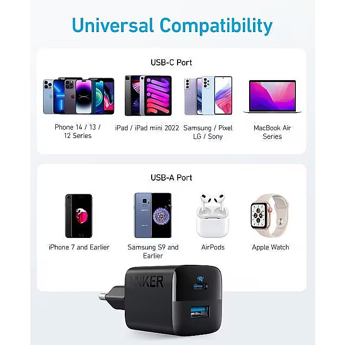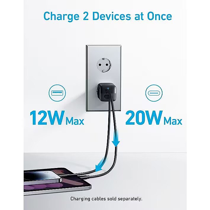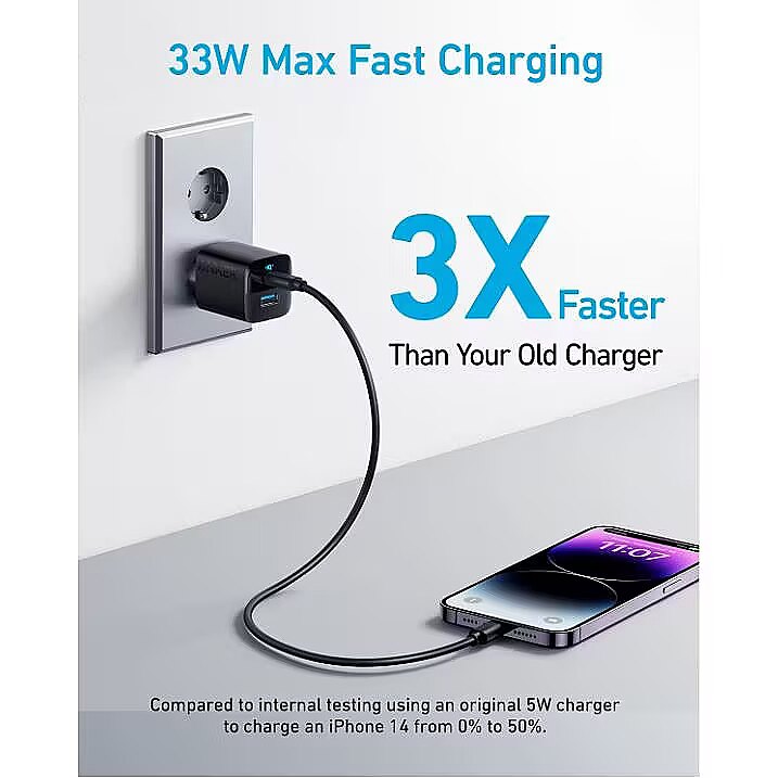Description - Anker 323 Charger (33W) The Ultra-Compact 2-Port Charger Powerful USB-C Charging The USB-C port has a max output of 33W enough to charge an iPhone 14 from 0% to 50% in just 25 minutes. Charge 2 Devices at Once Connect one device to the USB-C port to get a 20W charge, and connect another device to the USB-A port to charge at up to 12W. Wide Compatibility Works with virtually any handheld device including phones, tablets, and more. Charge with Peace of Mind Equipped with our ActiveShield safety system to offer enhanced protection. Features a Dynamic Temperature Sensor which actively monitors temperature, and a Power Tuner Chip which adjusts power output to safeguard your connected device. Ready to Take Anywhere Take this dual-port charger with youwherever you go thanks to the lightweight, compact design and foldable prongs.