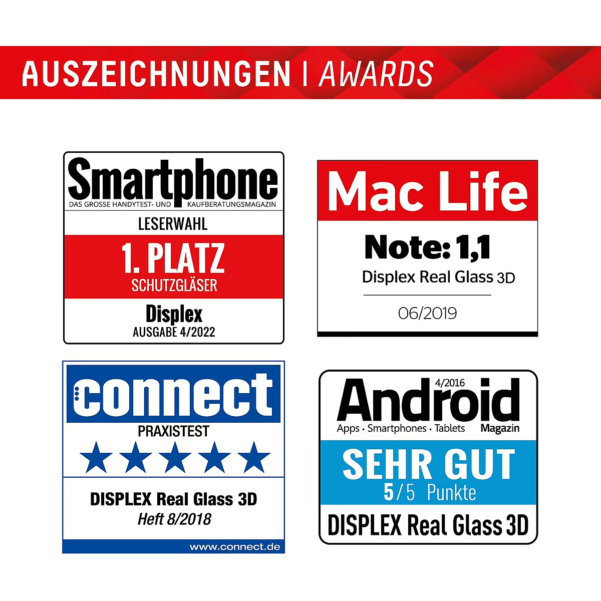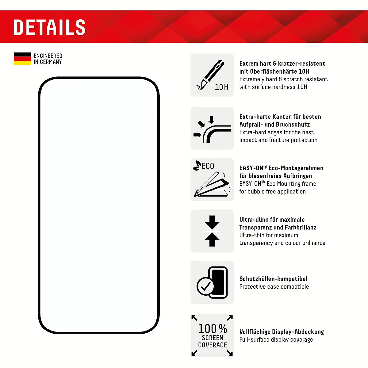 LongDesc - Full Cover or 3D/ Curved Real Glass with EASY-ON® Eco Mounting Frame Full screen coverageCompared to the so-called 2D protective glasses, Displex Full Cover protective glasses cover not only the active display area, but the entire display area. This means optimum protection of the entire display and an improved user experience: maximum protection without annoying edges.This feature is particularly advantageous for smartphones with rounded displays. Since the screen protector adapts perfectly to the rounded display and thus protects the entire display area. Tempered glass with rounded edgesAll Displex protective glasses have a surface hardness of 10H and are therefore not only more scratch-, break- and shock-resistant than comparable brand products, but even surpass sapphire glass, which is used in luxury watches and has a hardness of 9H.Even the edges, the area of the smartphone and protective glass most susceptible to breakage and impact, are specially hardened, rounded by 4-fold polishing and finished with a shock-absorbing edge. This elaborate production process further increases the protection against knocks and bumps and allows a particularly pleasant use of the smartphone. With these features, the protective glass is extremely resistant and guarantees maximum breakage resistance. Case-friendlyOur Displex protective glass is manufactured to within 5/100 mm of the smartphone contours and therefore fits perfectly on your smartphone. In addition, the protective film is ultra-thin at 3mm. This means that all standard-sized protective cases can be used with the screen protection glass. Thus, your smartphone is optimally protected all around by a combined protection of the Displex Tempered Glass and your favourite case. Anti fingerprint coatingThe top layer of our 4-Layer Technology is a high-tech plasma coating. With an extremely long-lasting effect, this coating effectively repels fingerprints. In addition, the plasma coating guarantees a soft scrolling experience. This technology not only makes your display look better, but it also keeps it cleaner and therefore requires less frequent cleaning. High-tech splinter protectionThe high-tech shatter protection integrated in the Real Glass from Displex guarantees absolute safety even if the protective glass breaks. Thanks to the composite material of the second layer in the protective glass, it does not shatter and thus guarantees absolutely safe use. If the worst should come to the worst and the protective glass has absorbed a blow, fall or impact and is broken, the Displex protective glass can be easily pulled off the display in one piece thanks to the integrated high-tech shatter protection. High-performance adhesiveOnce the protective glass has been fitted, the high-performance adhesive ensures optimum adhesion properties and a clear look. The adhesive is adapted to all display coatings of the various manufacturers so that the protective film for mobile phones holds reliably in the long term. The visual appearance is not affected either: despite the screen protection film, you can enjoy gripping videos and photos with maximum transparency and colour fidelity. Simple & bubble-free applicationWith the EASY-ON® Eco Mounting Frame and the accompanying video tutorials, mounting the tempered glass is incredibly quick, easy and precise. In addition the EASY-ON® Eco Mounting Frame is made of premium solid cardboard and is therefore not only sustainable, but also a 100% recyclable. The result is worth seeing: no crooked positioning of the screen protector on the display, no concealed openings for speakers or microphones and certainly no bubbles under the protective glass.