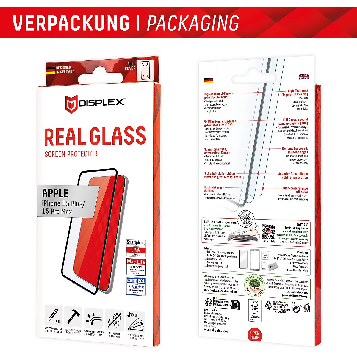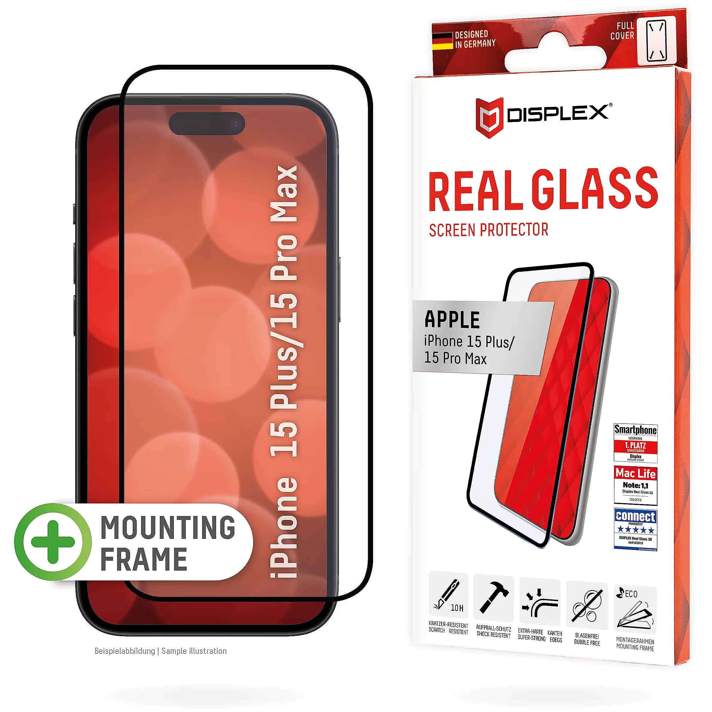LongProductName - DISPLEX Full Cover Screen Protector (10H) for Apple iPhone 15 Plus/15 Pro Max, Eco Mounting Frame, full screen coverage, Tempered Glass, scratch resistant protective film, case friendly