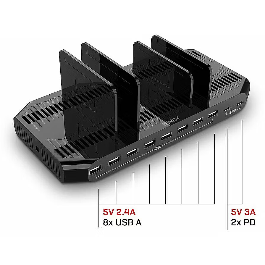 LongDesc - The Lindy 120W 10 Port USB Charging Station allows charging up to 8 USB devices via Type A and 2 via Type C like tablets or smartphones.Each USB Type A port can provide up to 5V 2.4A, each USB Type C port can provide up to 5V 3A to satisfy the most power hungry devices. If all 10 ports are occupied and/or when total power draw is higher than 120W, load balancing will occur.With its smart charging function and support of many different protocols likeQC 3.0 (only type C ports) , Samsung AFC and Apple 5V 2.4A Charging Protocol and BC 1.2 (only Type A ports)this USB Charging Station can recognise the connected device to automatically adjust the charging current for a fast and safe charge while also providing overcurrent, overvoltage and short-circuit protection to avoid excessive current damaging the device.Plastic dividers can be assembled and stood on the top of the unit, which allows different widths for different tablets or mobile phone sizes. This product is perfect for use in schools, libraries, hotels, restaurants or any location that uses multiple devices. Country specific power cables are provided for seamless use of the charging station, ideal for global events or integration into installations abroad.