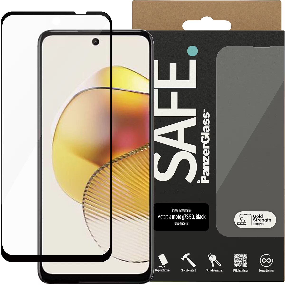LongSummaryDescription - PanzerGlass SAFE. by ® Screen protector Motorola moto g73 5G | Ultra-Wide Fit. Brand compatibility: Motorola, Compatibility: Motorola - moto g73 5G. Dry application. Protection features: Scratch resistant, Shock resistant. Material: Tempered glass, Polyethylene terephthalate (PET), Product colour: Transparent. Quantity per pack: 1 pc(s)