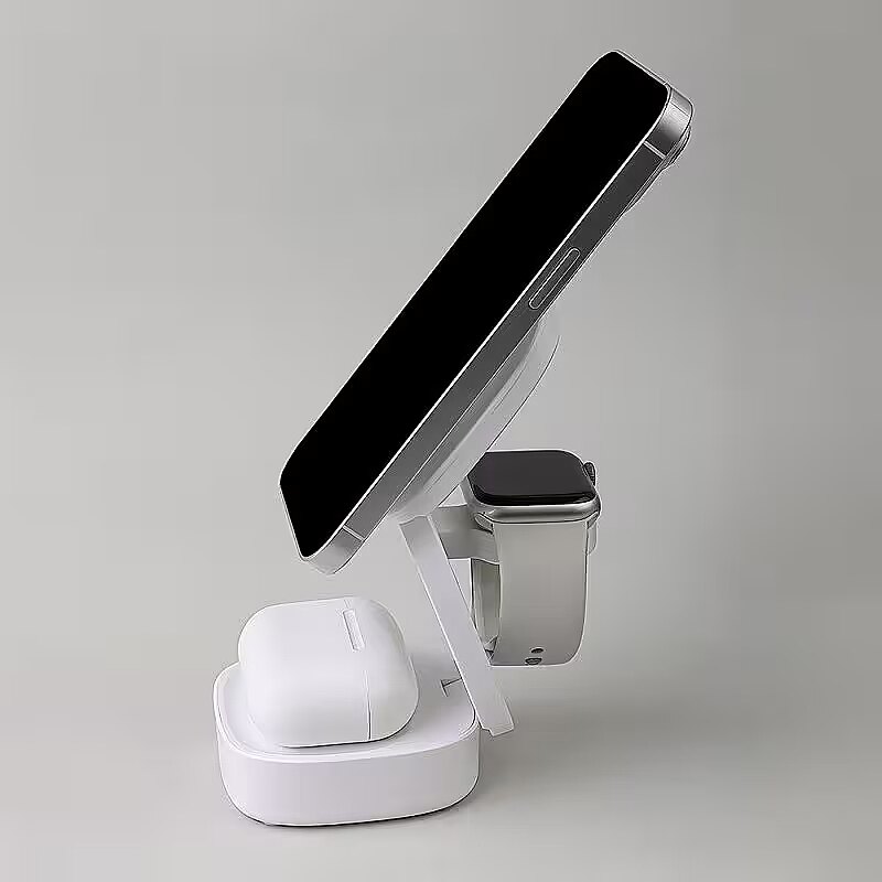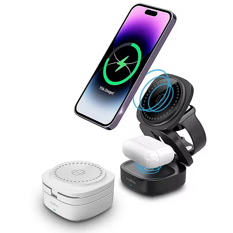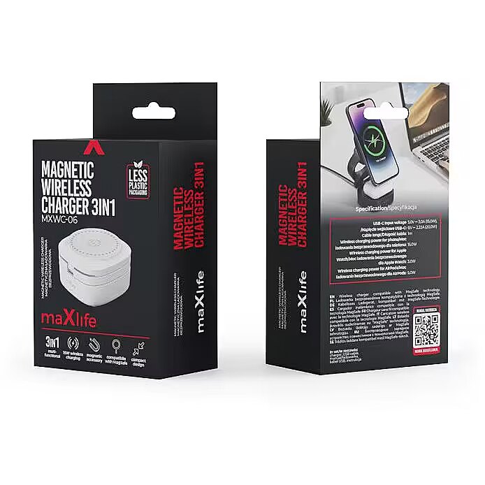 description_en - The Maxlife 3-in-1 Wireless Charger is a compact and lightweight device, ideal for everyday use in the office or while traveling. Its foldable design takes up minimal space, making it easy to carry in bags or suitcases. Compatible with MagSafe and all phones that support wireless charging, the charger offers fast and hassle-free charging with up to 15W of power. Strong magnets ensure a stable connection with devices, allowing you to wirelessly charge three different devices simultaneously, including a phone, headphones, and a smartwatch. The package includes a USB to USB-C cable, enhancing functionality and convenience. Multifunctional wireless charger Allows you to charge three devices simultaneously Compatible with all Qi-compatible smartphones Charging power: 15 W Compact, foldable design