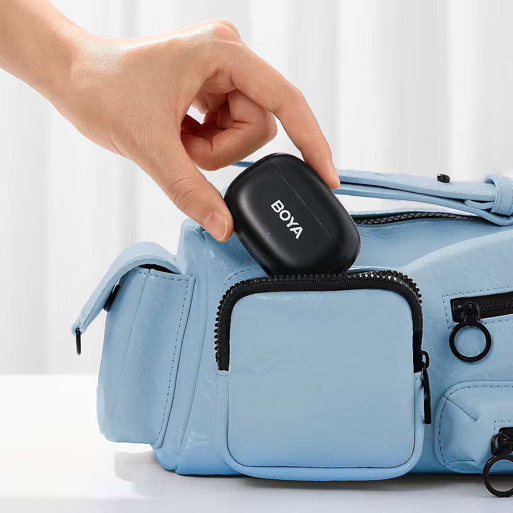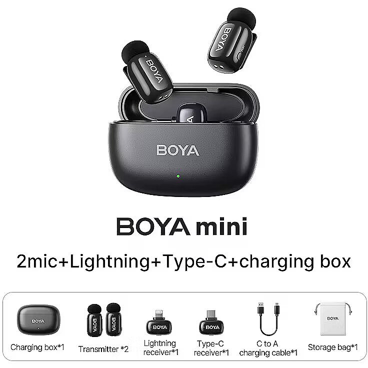 description_en - Meet Boya Boya mini, the world's tiniest wireless microphone. Weighing only 5 g, its streamlined design fits seamlessly with your clothing, offering a weightless feel that makes it perfect for your recording anytime, anywhere. Capture sound naturally and discreetly. Thumb-sized microphone weighs as little as 5 g 3-grade AI noise cancellation Studio-Quality Sound Wireless connection & Plug and Play Auto Pairing Reliable transmission range up to 100 m 30-Hour Battery Life The Boya mini-12 kit is perfect for recording with a variety of smartphones, tablets and computers. The kit includes two transmitters, one Lightning receiver for iOS devices, one USB-C receiver for smartphones and computers with a USB-C connection, and a charging case that provides up to 30 hours of battery life. Sound Clear