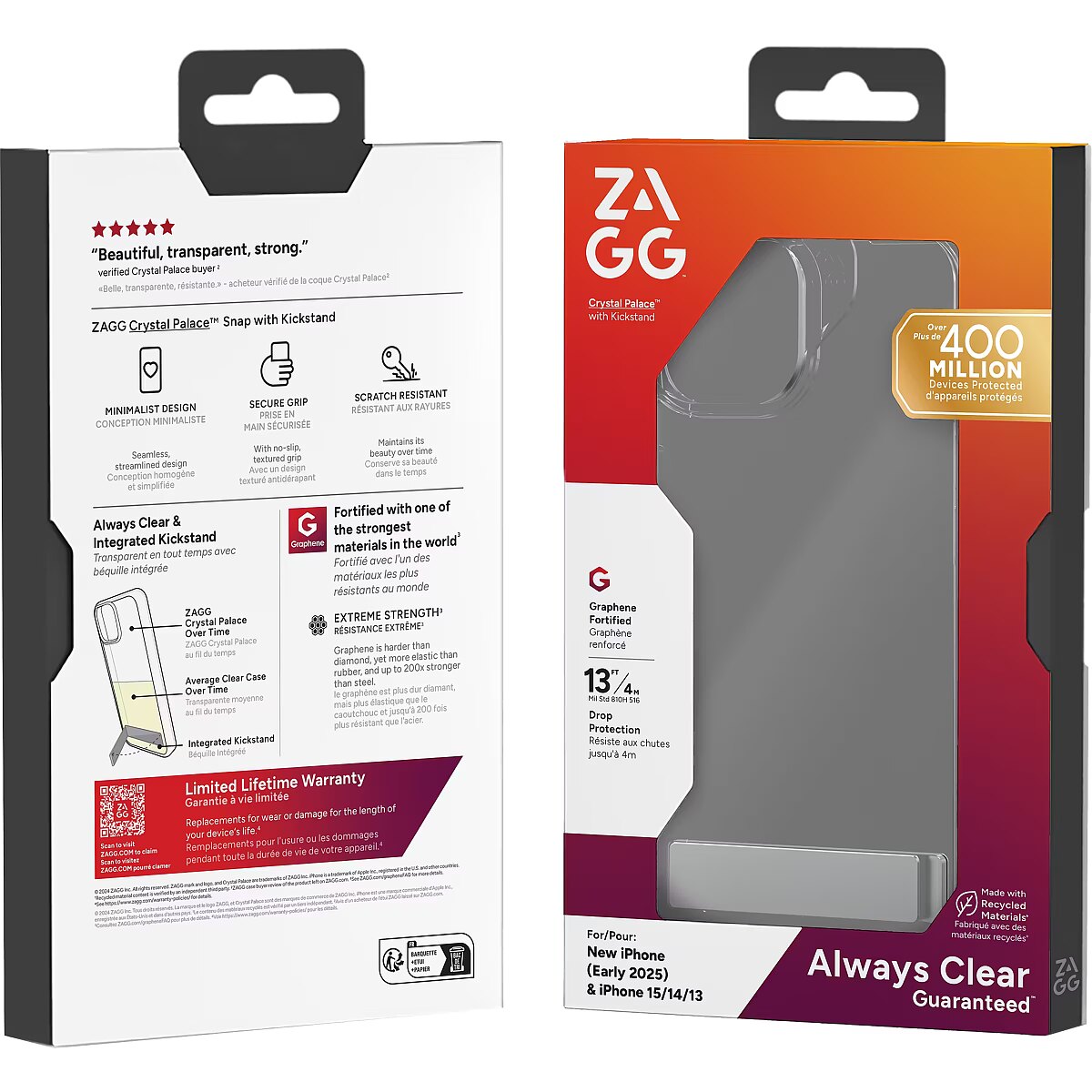 ShortSummaryDescription - ZAGG Crystal Palace Kickstand Case iPhone 16/15/14/13 Clear, Cover, Apple, iPhone 17e/16e/15/14/13, 15.5 cm (6.1"), Transparent