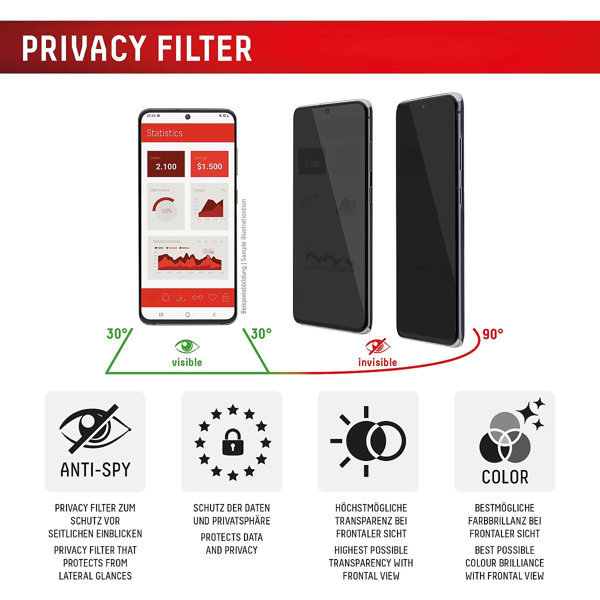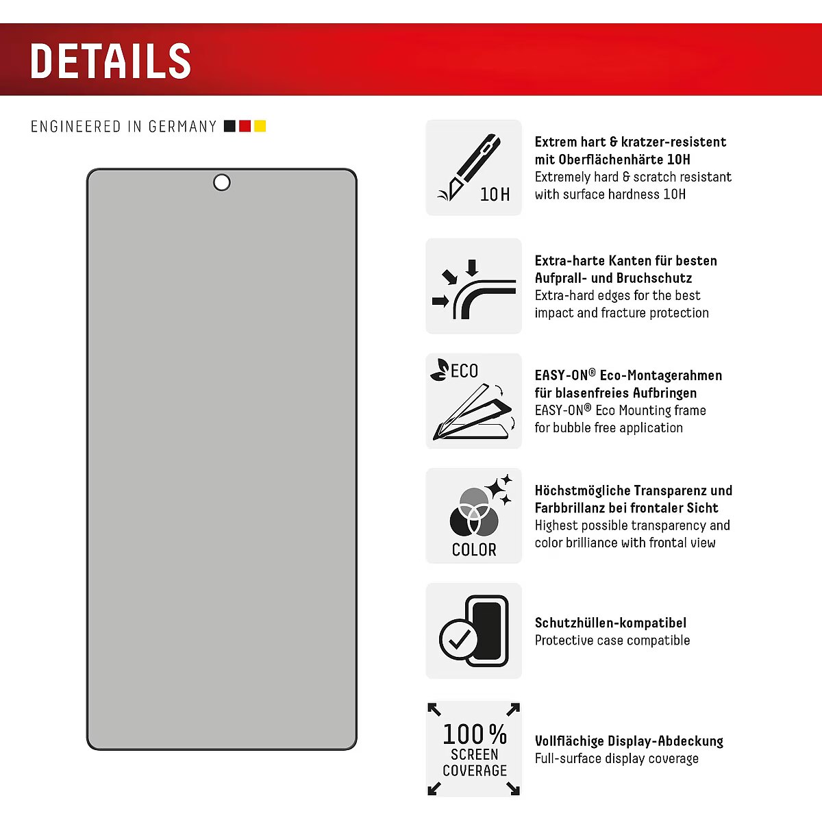 LongDesc - PRIVACY Full Cover Real Glass with EASY-ON® Eco Mounting Frame Privacy FilterThanks to the special privacy filter integrated into the protective glass, the display light is only transmitted from a certain viewing angle. This means that the screen appears black from a viewing angle of 30° or more. The glass thus offers effective protection against side glances from, for example, seat neighbours on trains, planes or buses. And all of this, of course, without any negative impact on colour fidelity or display quality. So if you use your smartphone to store and edit sensitive data - whether for business or private use - the Privacy Glass is an option worth considering. Full screen coverageCompared to the so-called 2D protective glasses, Displex Full Cover protective glasses cover not only the active display area, but the entire display area. This means optimum protection of the entire display and an improved user experience: maximum protection without annoying edges.This feature is particularly advantageous for smartphones with rounded displays. Since the screen protector adapts perfectly to the rounded display and thus protects the entire display area. Tempered glass with rounded edgesAll Displex protective glasses have a surface hardness of 10H and are therefore not only more scratch-, break- and shock-resistant than comparable brand products, but even surpass sapphire glass, which is used in luxury watches and has a hardness of 9H.Even the edges, the area of the smartphone and protective glass most susceptible to breakage and impact, are specially hardened, rounded by 4-fold polishing and finished with a shock-absorbing edge. This elaborate production process further increases the protection against knocks and bumps and allows a particularly pleasant use of the smartphone. With these features, the protective glass is extremely resistant and guarantees maximum breakage resistance. Case-friendlyOur Displex protective glass is manufactured to within 5/100 mm of the smartphone contours and therefore fits perfectly on your smartphone. In addition, the protective film is ultra-thin at 0,3mm. This means that all standard-sized protective cases can be used with the screen protection glass. Thus, your smartphone is optimally protected all around by a combined protection of the Displex Tempered Glass and your favourite case. Anti Fingerprint The top layer of our 5-Layer Technology consists of a high-tech plasma coating. The hydrophobic anti-fingerprint coating is grease and dirt repellent, extremely long-lasting and ensures optimal touch and scrolling. This technology not only makes your display look better, it also keeps it clean longer, so it requires less frequent cleaning. High-tech splinter protectionThe high-tech shatter protection integrated in the Real Glass from Displex guarantees absolute safety even if the protective glass breaks. Thanks to the composite material of the second layer in the protective glass, it does not shatter and thus guarantees absolutely safe use. If the worst should come to the worst and the protective glass has absorbed a blow, fall or impact and is broken, the Displex protective glass can be easily pulled off the display in one piece thanks to the integrated high-tech shatter protection. High-performance adhesiveOnce the protective glass has been fitted, the high-performance adhesive ensures optimum adhesion properties and a clear look. The adhesive is adapted to all display coatings of the various manufacturers so that the protective film for mobile phones holds reliably in the long term. The visual appearance is not affected either: despite the screen protection film, you can enjoy gripping videos and photos with maximum transparency and colour fidelity. Simple & bubble-free applicationWith the EASY-ON® Eco Mounting Frame and the accompanying video tutorials, mounting the tempered glass is incredibly quick, easy and precise. In addition the EASY-ON® Eco Mounting Frame is made of premium solid cardboard and is therefore not only sustainable, but also a 100% recyclable. The result is worth seeing: no crooked positioning of the screen protector on the display, no concealed openings for speakers or microphones and certainly no bubbles under the protective glass.