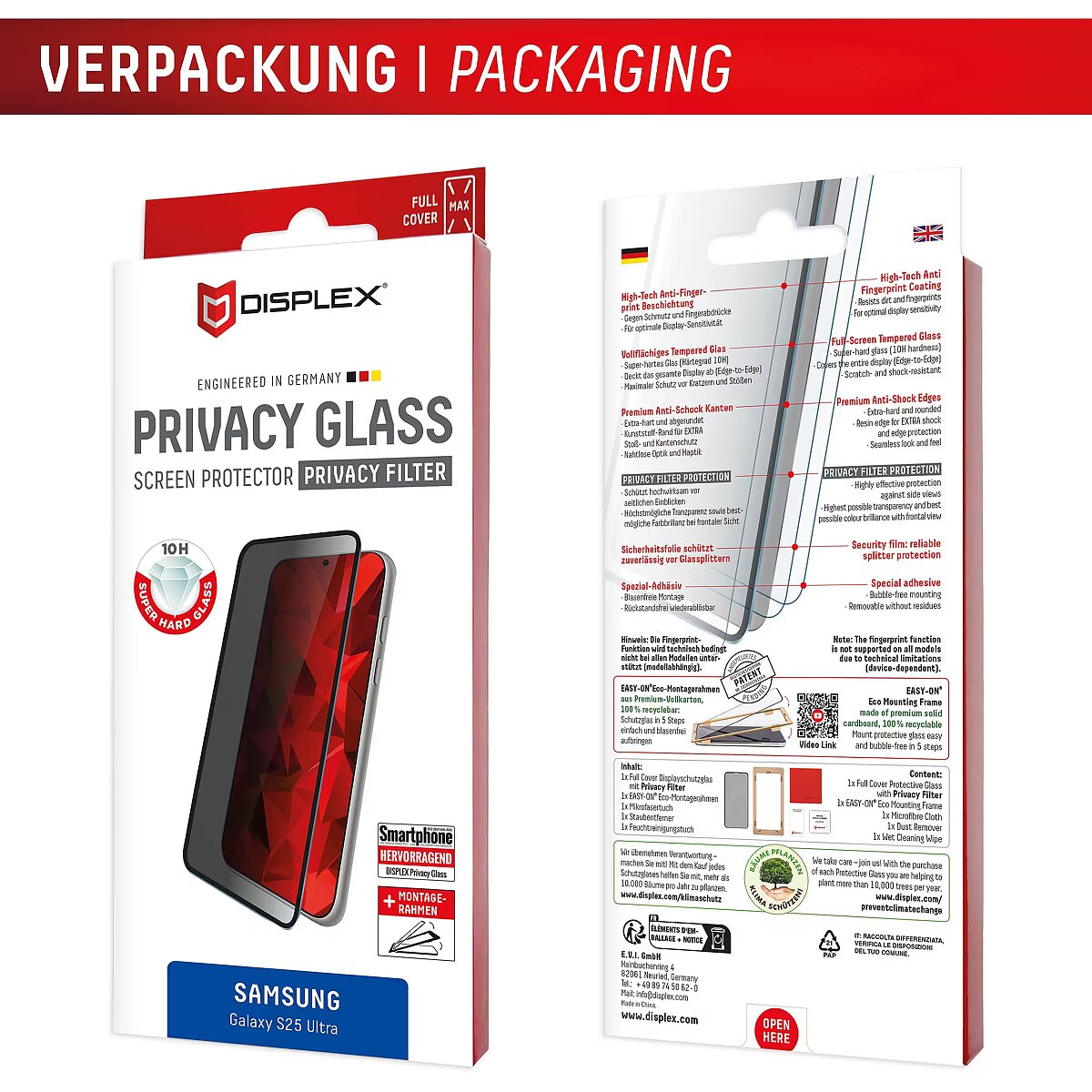 LongSummaryDescription - Displex Privacy Screen Protector (10H) for Samsung Galaxy S25 Ultra, Eco Mounting Frame, Privacy Filter. Brand compatibility: Samsung, Compatibility: Galaxy S25 Ultra. Dry application. Protection features: Dust resistant, Impact resistant, Scratch resistant, Shock resistant. Privacy filtering function, Material: Tempered glass, Product colour: Transparent. Quantity per pack: 1 pc(s)