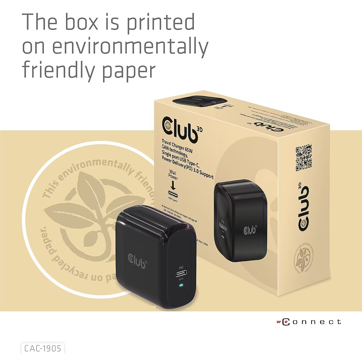 Title - CLUB3D Travel Charger 65W GAN technology, Single port USB Type-C, Power Delivery(PD) 3.0 Support