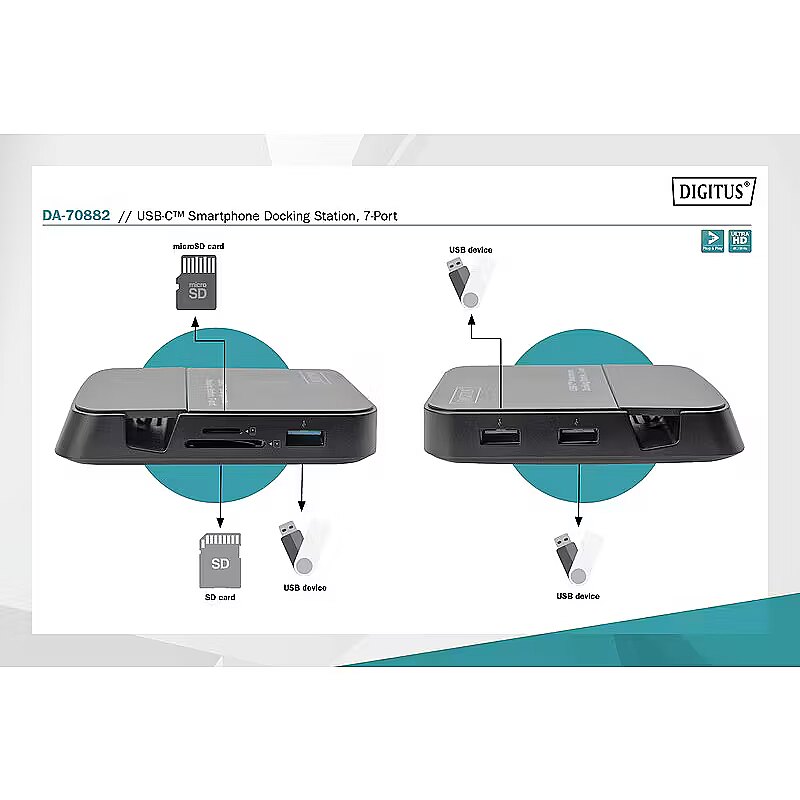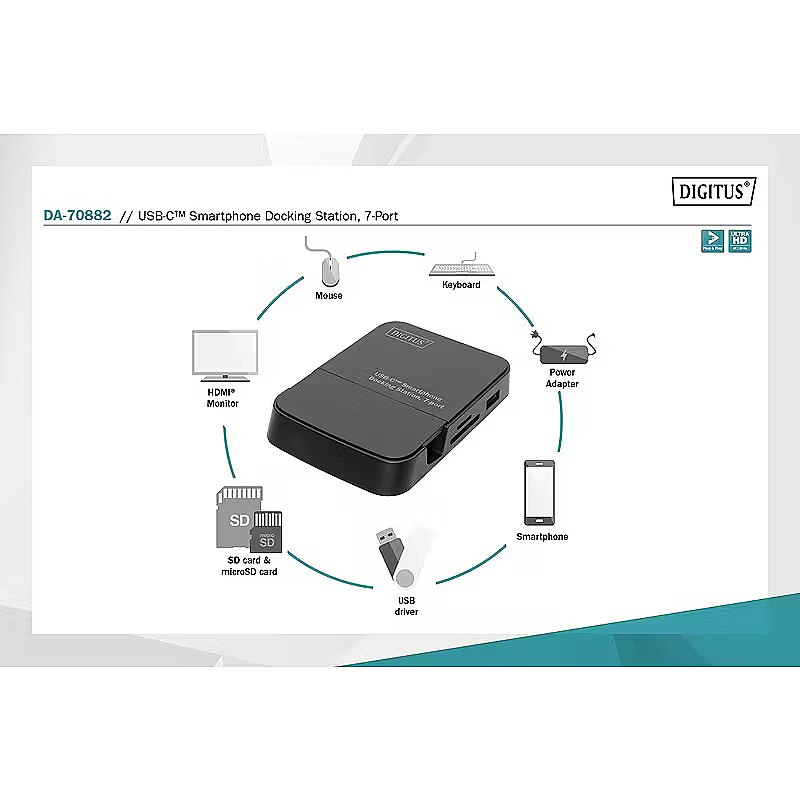 Name - Digitus USB-C Smartphone Docking Station, 7 Port | DA-70882 | USB 3.0 (3.1 Gen 1) ports quantity 1 | USB 2.0 ports quantity 2 | HDMI ports quantity 1