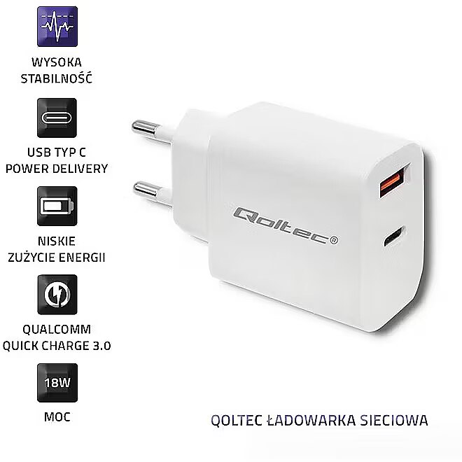 Name - Qoltec 18W | 5-12V | 1.5-3A | USB typ C PD | USB QC 3.0 | Biała