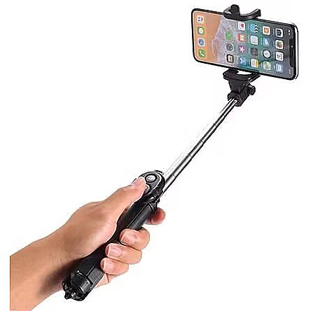 description_en - Selfie stick with a tripod function is an indispensable accessory for every fan of photography and social media. This selfie stick isn’t made only for taking traditional selfies. Fold the tripod out, place your phone in the holder, and take photos from the distance using a remote control, which is in the set. The remote control is powered by a replaceable battery, and works thanks to the Bluetooth technology. The rotatable phone holder enables you to take photos both horizontally and vertically.