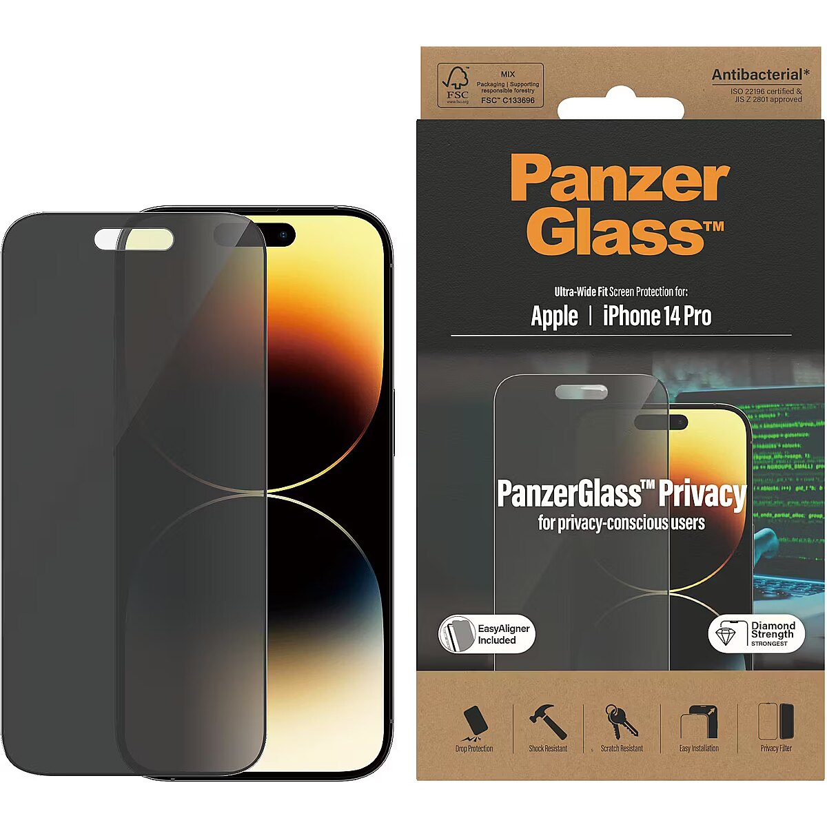 LongSummaryDescription - PanzerGlass ® Privacy Screen Protector iPhone 14 Pro | Ultra-Wide Fit w. EasyAligner. Brand compatibility: Apple, Compatibility: Apple - iPhone 14 Pro. Dry application. Protection features: Scratch resistant, Shock resistant, Anti-bacterial. Privacy filtering function, Material: Tempered glass, Polyethylene terephthalate (PET), Silicone, Product colour: Transparent. Quantity per pack: 1 pc(s)