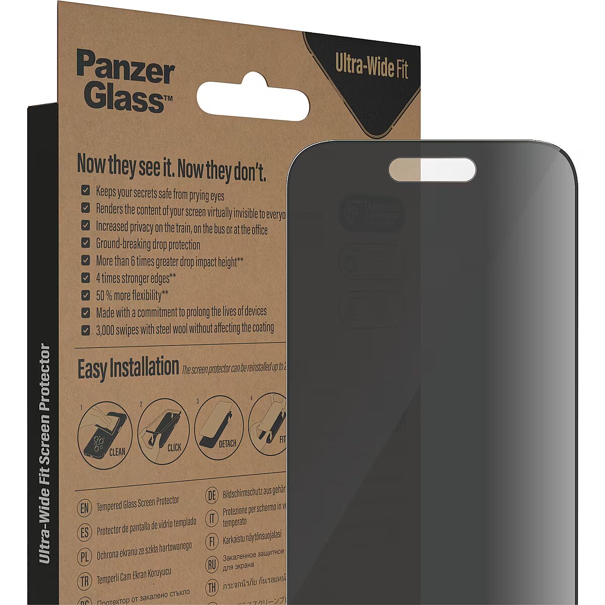 LongDesc - Private messages. Bank details. Pin codes. With this screen protector from PanzerGlass®, your secrets are safe from the prying eyes of people sitting next to you on the train, on the bus or in the office. The specially designed privacy filter renders the content of your screen virtually invisible to everyone except you.Accidental bumps against sharp-edged dangers in your pocket or crushing falls onto stone-hard pavements are also no match for this scratch and shock-resistant screen protector, which provides high-level drop protection. It even has a smudge-free coating with antibacterial effect that reduces traces of fingerprints and kills up to 99.99% of all common surface bacteria.The screen protector comes with an EasyAligner that makes installation so simple you can do it perfectly on the first attempt… even if you’re all thumbs. And once it’s installed, you’ll never again fear the sight of your phone tumbling to the ground. This may not happen, but if it does, you’ll regret not having clicked “add to cart”.The Ultra-Wide Fit screen protector covers the entire front surface of your phone, while still leaving room for a case. It provides a complete and crystal-clear view of your screen and comes in FSC™-certified packaging that can be recycled.