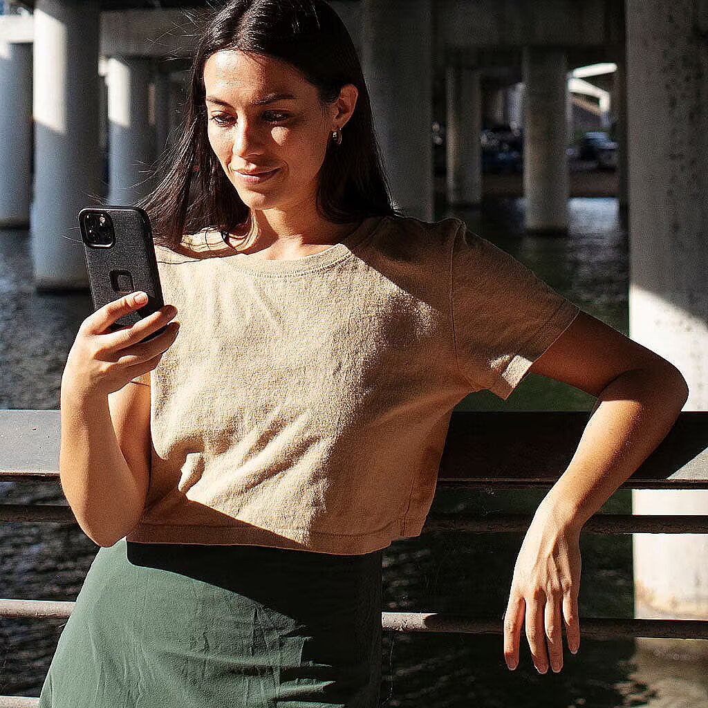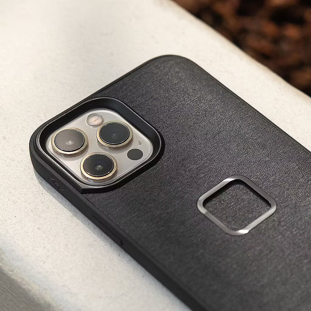 A phone case with the perfect balance of slimness, smart aesthetics, and protection, plus it brilliantly connects to the entire Peak Design Mobile Ecosystem (and MagSafe accessories, too). It's like a tuxedo for your phone—a tuxedo with a slim 2.4 mm profile and protective rubberized bumper, all wrapped in beautiful nylon canvas shell. But what truly sets the Everyday Case apart is the brilliant magnetic/mechanical lock that's built right into it. We call this mounting technology SlimLink™, and it's so fast and secure that it borders on magic. With this case on your phone, you can instantly connect to all Peak Design Mobile mounts, chargers, and accessories. It even works with Apple MagSafe chargers and accessories, too. Unlock the peak design ecosystem Connects to all Peak Design Mobile mounts & accessories Built-in magnetic locking technology (called SlimLink™) is ultra secure and feels like magic Works with MagSafe Compatible with MagSafe accessories & chargers Slim & protective Super-slim 2.4mm profile Rubberized full-surround shock-absorbing bumper Protective lip around screen and camera lenses Rugged 2m (6ft) drop protection Better materials = better case Nylon canvas fabric shell is weatherproof, 100% recycled, and Bluesign-approved Ultralight polycarbonate body Works with peak design straps 2 mounting points for Peak Design Anchors let you tether/carry your phone with any Peak Design strap