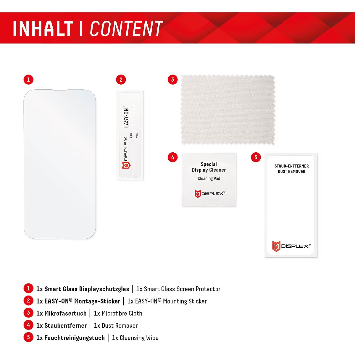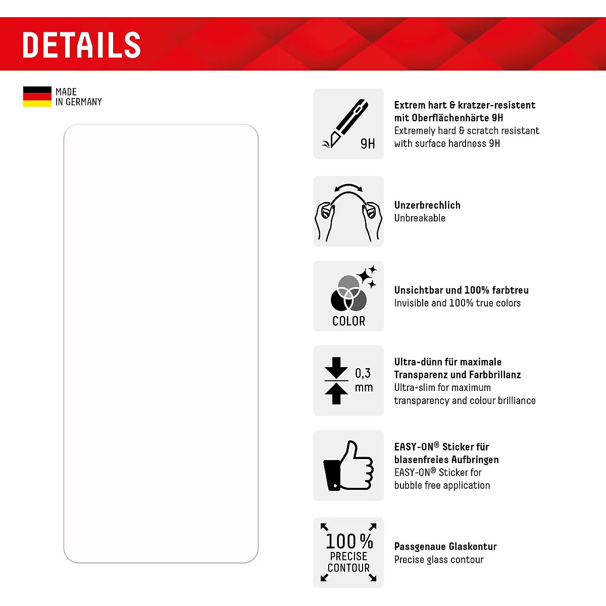LongDesc - Smart Glass (9H), unbreakable, ultra-thin, invisible, with EASY-ON® Stickers DISPLEX Smart Glass is a combination of conventional protective glass and extremely thin, flexible, virtually indestructible protective film. With a surface hardness of 9H, it offers very good protection against scratches and other damage. At the same time, with 0.25mm, it is ultra-thin, resistant, flexible or bendable and therefore almost indestructible. The DISPLEX Smart Glass is manufactured with the latest laser technology in our production facility in Straubing, Germany, and is precisely adapted to the contour of the smartphone display - Made in Germany. The unrestricted functionality, colour brilliance and case compatibility are of course guaranteed. Case-friendlyOur Displex protective glass is manufactured to within 5/100 mm of the smartphone contours and therefore fits perfectly on your smartphone. In addition, the protective film is ultra-thin at 3mm. This means that all standard-sized protective cases can be used with the screen protection glass Thus, your smartphone is optimally protected all around by a combined protection of the Displex Tempered Glass and your favourite case. Anti fingerprint coatingThe top layer of our 4-Layer Technology is a high-tech plasma coating. With an extremely long-lasting effect, this coating effectively repels fingerprints. In addition, the plasma coating guarantees a soft scrolling experience. This technology not only makes your display look better, but it also keeps it cleaner and therefore requires less frequent cleaning. High-performance adhesiveOnce the protective glass has been fitted, the high-performance adhesive ensures optimum adhesion properties and a clear look. The adhesive is adapted to all display coatings of the various manufacturers so that the protective film for mobile phones holds reliably in the long term. The visual appearance is not affected either: despite the screen protection film, you can enjoy gripping videos and photos with maximum transparency and colour fidelity. Simple & bubble-free applicationWith the EASY-ON® Stickers and the accompanying video tutorials, mounting the Tempered Glass is incredibly quick, easy and precise. The result is worth seeing: no crooked positioning of the screen protector on the display, no hidden openings for speakers or microphones and certainly no bubbles under the protective glass.