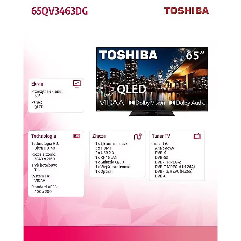 Poznaj nowy telewizor Toshiba QLED. Ciesz się wysoką, realistyczną jakością obrazu i dłuższą żywotnością telewizora przy maksymalnej wydajności. Telewizor QLED zapewnia głębszą czerń oraz bardziej nasycone, i dokładniejsze kolory.