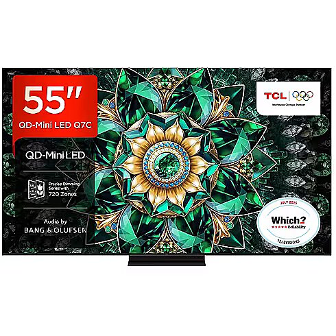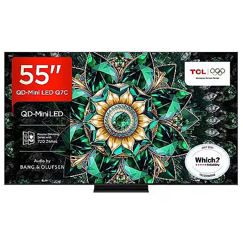 LongSummaryDescription - TCL 55Q7C. Display diagonal: 139.7 cm (55"), Display resolution: 3840 x 2160 pixels, HD type: 4K Ultra HD, Display technology: QD-Mini LED, Screen shape: Flat. Smart TV. Motion interpolation technology: PPI (Picture Performance Index) 4600, Display brightness: 2600 cd/m², Contrast ratio (typical): 6500:1, Native aspect ratio: 16:9. Digital signal format system: DVB-C, DVB-S2, DVB-T2. Wi-Fi, Ethernet LAN. Product colour: Metallic