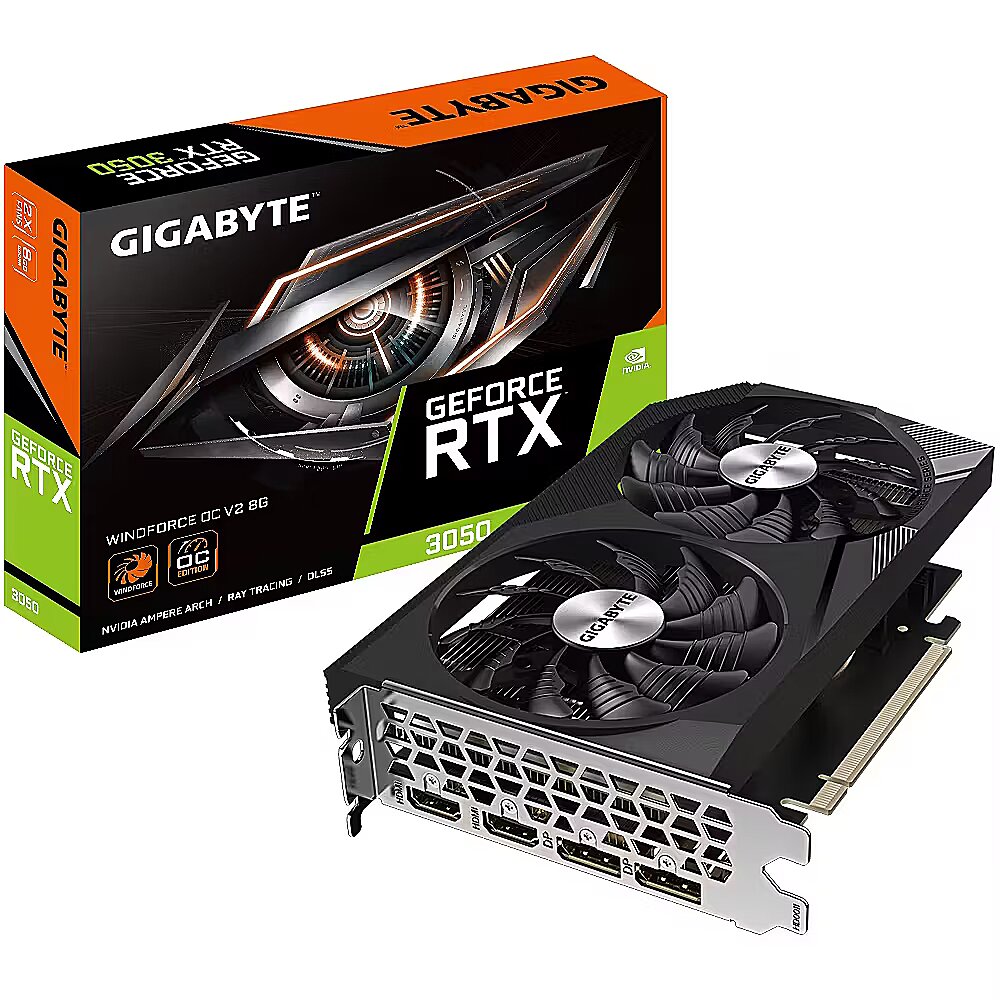 Summary - GIGABYTE GeForce RTX 3050 WINDFORCE OC V2 8G. Graphics processor family: NVIDIA, Graphics processor: GeForce RTX 3050, Processor frequency: 1792 MHz. Discrete graphics card memory: 8 GB, Graphics card memory type: GDDR6, Memory bus: 128 bit, Memory clock speed: 14000 MHz. Maximum resolution: 7680 x 4320 pixels. DirectX version: 12 Ultimate, OpenGL version: 4.6, Dual Link DVI. Interface type: PCI Express 4.0. Cooling type: Active, Number of fans: 2 fan(s)