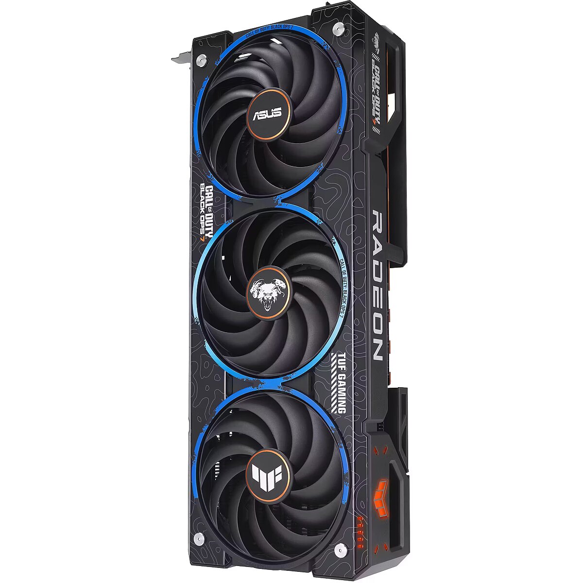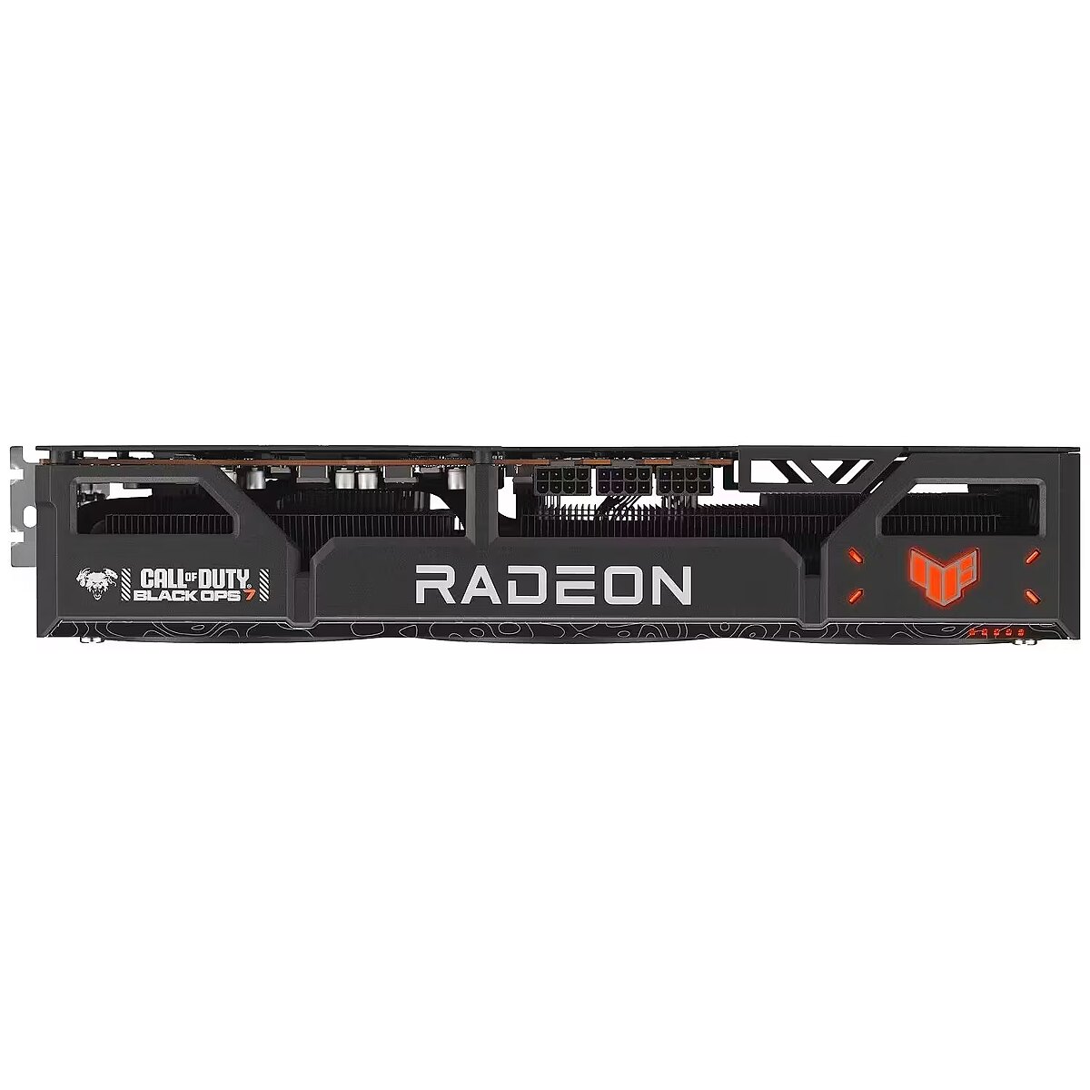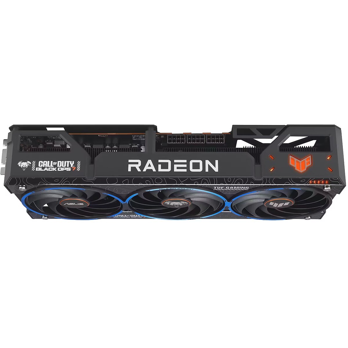 LongDesc - ASUS TUF Gaming Radeon™RX 9070 XT Black Ops 7 Special Edition Game TUF. Built to Last. This limited, special edition graphics card is a collaboration between ASUS, AMD, and Call of Duty® : Black Ops 7. Its customized chassis and backplate feature Black Ops 7 elements and iconography, including the Black Ops 7 icon and orange accents in signature Black Ops style. Inside is the venerable Radeon™ RX 9070 XT GPU with the latest RDNA 4 architecture from AMD, 16GB of VRAM, the HYPR-RX™ feature set and a super-resolution mode that leverages machine learning.TUF Chokes & MOSFETsCertified military-grade TUF chokes and MOSFETs deliver rock-solid power to the GPU, which can help improve system stability.TUF CapacitorsTUF 5K black metallic capacitors provide 52% wider temperature tolerance and a 2.5X longer lifespan than standard capacitors.