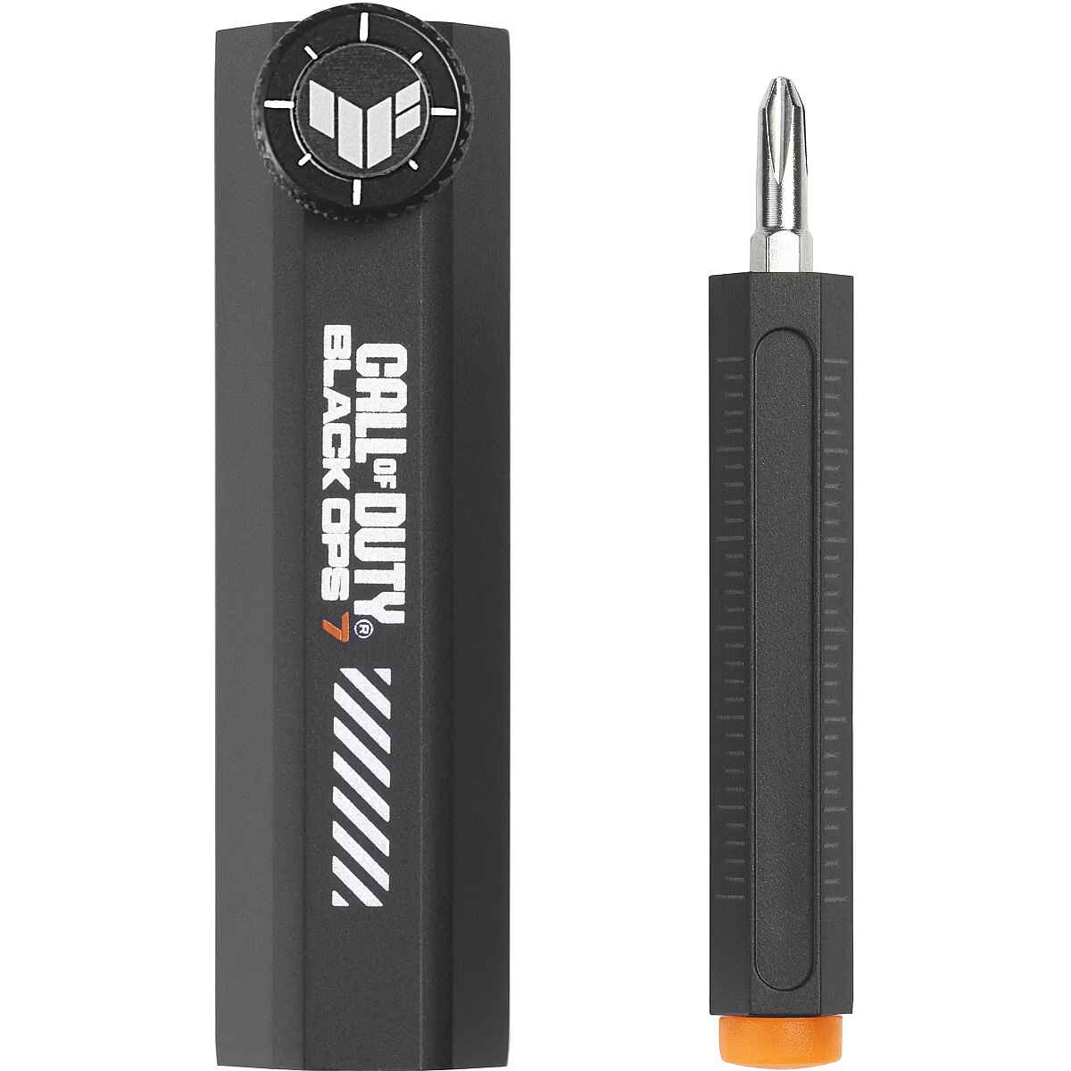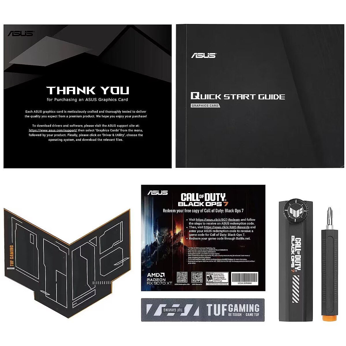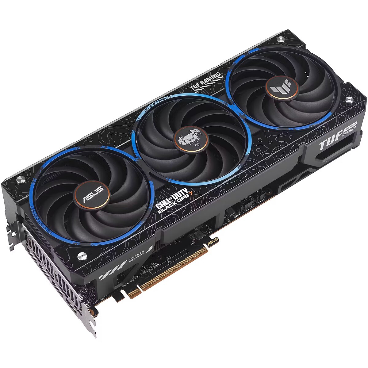 LongDesc - ASUS TUF Gaming Radeon™RX 9070 XT Black Ops 7 Special Edition Game TUF. Built to Last. This limited, special edition graphics card is a collaboration between ASUS, AMD, and Call of Duty® : Black Ops 7. Its customized chassis and backplate feature Black Ops 7 elements and iconography, including the Black Ops 7 icon and orange accents in signature Black Ops style. Inside is the venerable Radeon™ RX 9070 XT GPU with the latest RDNA 4 architecture from AMD, 16GB of VRAM, the HYPR-RX™ feature set and a super-resolution mode that leverages machine learning.TUF Chokes & MOSFETsCertified military-grade TUF chokes and MOSFETs deliver rock-solid power to the GPU, which can help improve system stability.TUF CapacitorsTUF 5K black metallic capacitors provide 52% wider temperature tolerance and a 2.5X longer lifespan than standard capacitors.