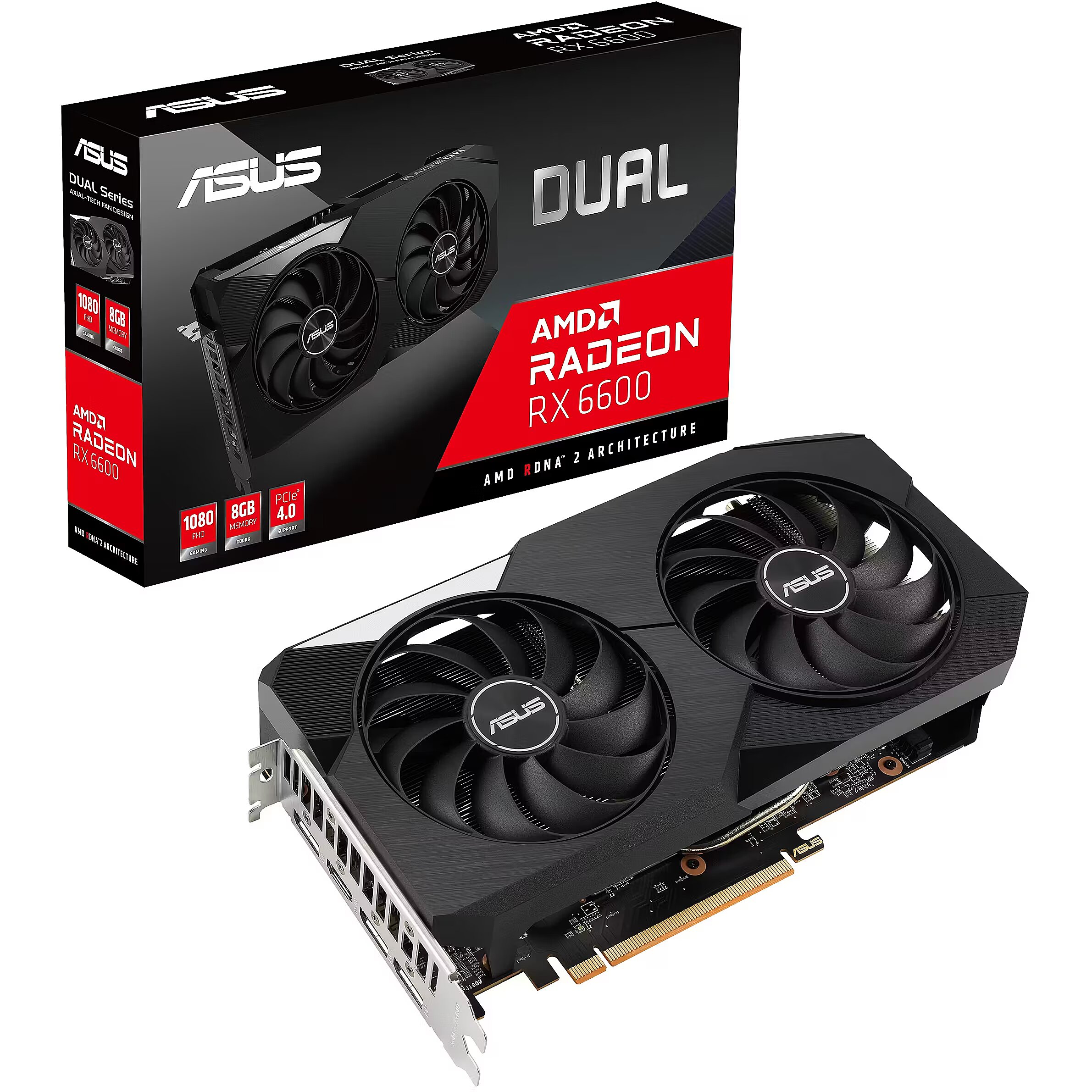 LongSummaryDescription - ASUS Dual -RX6600-8G. Graphics processor family: AMD, Graphics processor: Radeon RX 6600, Processor frequency: 2044 MHz. Discrete graphics card memory: 8 GB, Graphics card memory type: GDDR6, Memory bus: 128 bit. Maximum resolution: 7680 x 4320 pixels. OpenGL version: 4.6. Interface type: PCI Express 4.0. Cooling type: Active, Number of fans: 2 fan(s)