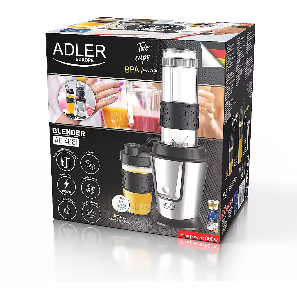 Name - Adler | Blender | AD 4081 | Tabletop | 800 W | Jar material BPA Free Plastic | Jar capacity 0.4 + 0.57 L | Ice crushing | Black/Stainless steel