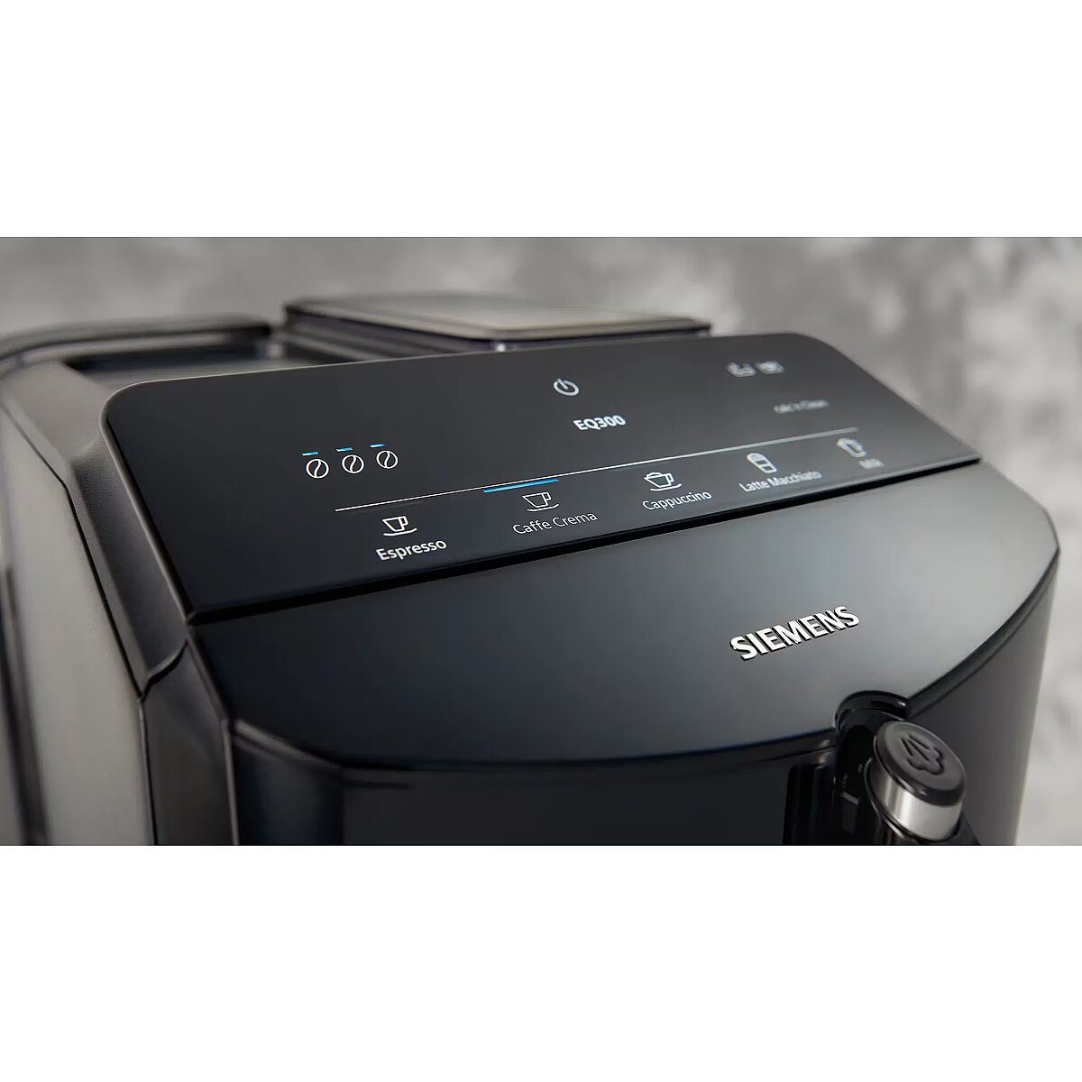 MediumDescription EN - The Siemens EQ300 fully automatic espresso machine lets you prepare a variety of coffee drinks at the touch of a button. It features a 1.4-liter water tank and a 250-gram bean container. The sleek black design brings a modern touch to any kitchen. • One-touch drink selection