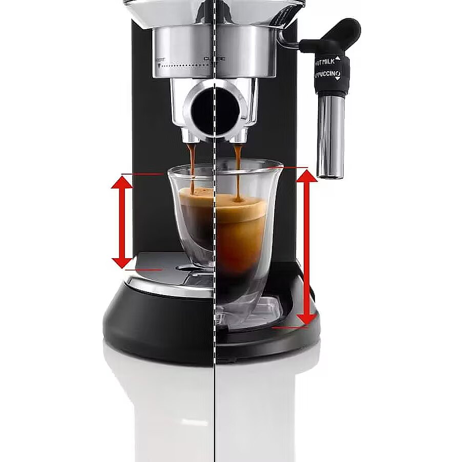 Elegancki kompaktowy ekspres do kawy, który doskonale wpasuje się w estetykę Twojej kuchni. Dzięki błyszczącemu korpusowi ze stali nierdzewnej i czarnemu matowemu wykończeniu, ekspres kolbowy do kawy espresso Dedica doda prawdziwie włoskiego charakteru każdej kuchni. Delektuj się bogatym, delikatnym espresso lub dodaj do swojej kawy gorące, spienione mleko lub kremową piankę mleczną spienioną za pomocą regulowanego Systemu Cappuccino. Delektuj się bogatym, delikatnym espresso z idealną cremą, zaparzając swoją ulubioną mieszankę kawy lub saszetkę Technologia Termoblok zapewnia optymalną temperaturę do parzenia doskonałego espresso Ciesz się szeroką gamą kaw mlecznych dzięki regulowanemu systemowi spieniania mleka Cappuccino Elegancki kompaktowy ekspres do kawy z błyszczącym korpusem ze stali nierdzewnej i czarnym matowym wykończeniem Prawdziwy włoski design