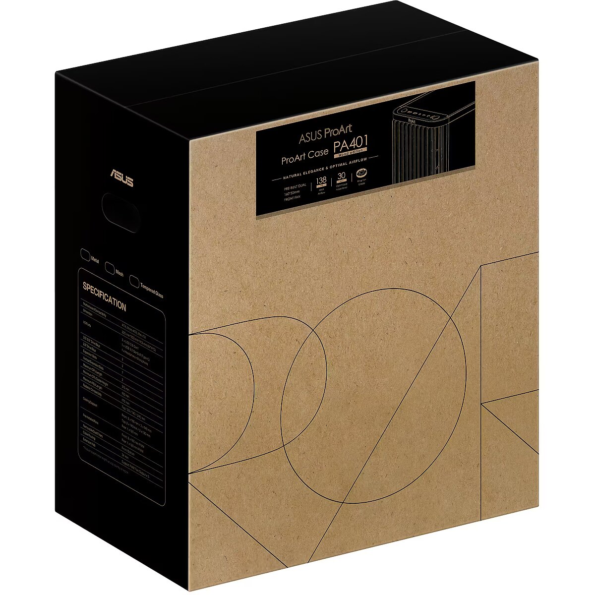 LongDesc - ProArt PA401 Wood Edition Mesh PanelNatural Elegance, Optimal AirflowThe ProArt PA401 Wood Edition showcases a wooden front panel that creates a distinctive, elegant style while promoting sustainability. The wood used is certified by the Forest Stewardship Council® (FSC®), and is finished using a six-stage process. The case also boasts optimal built-in cooling, with two 160mm front fans and one 120mm rear fan, along with an integrated fan hub, enabling optimal airflow.
