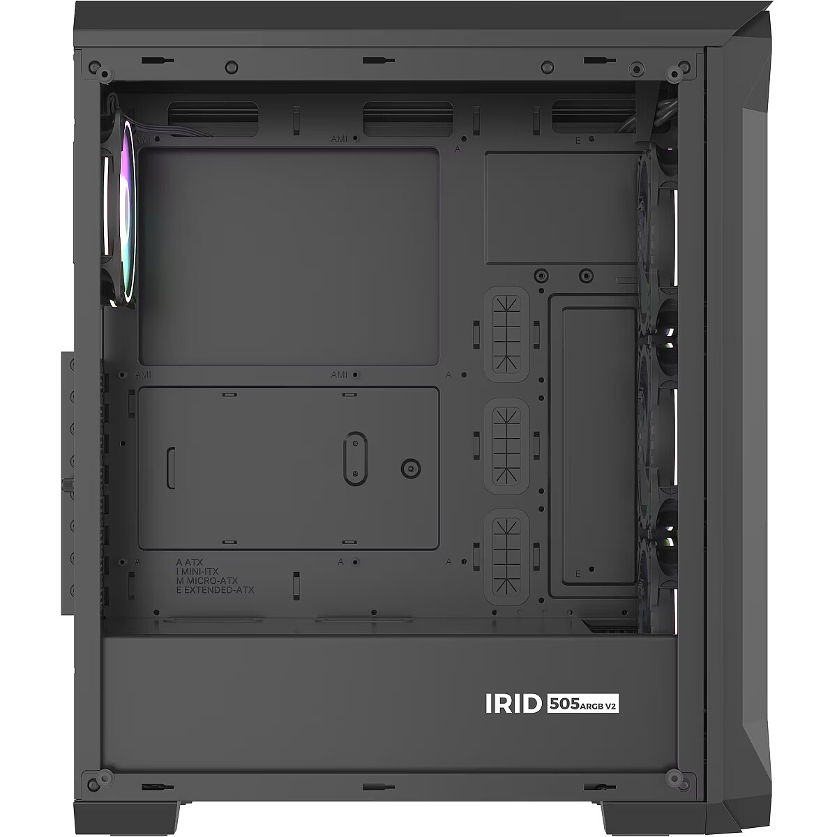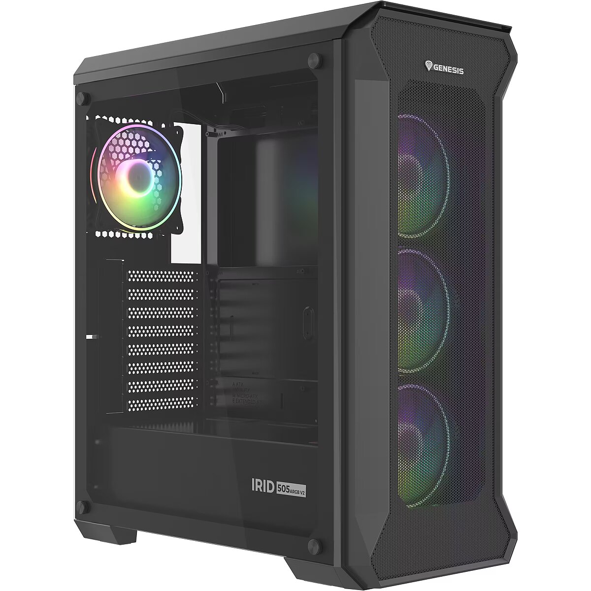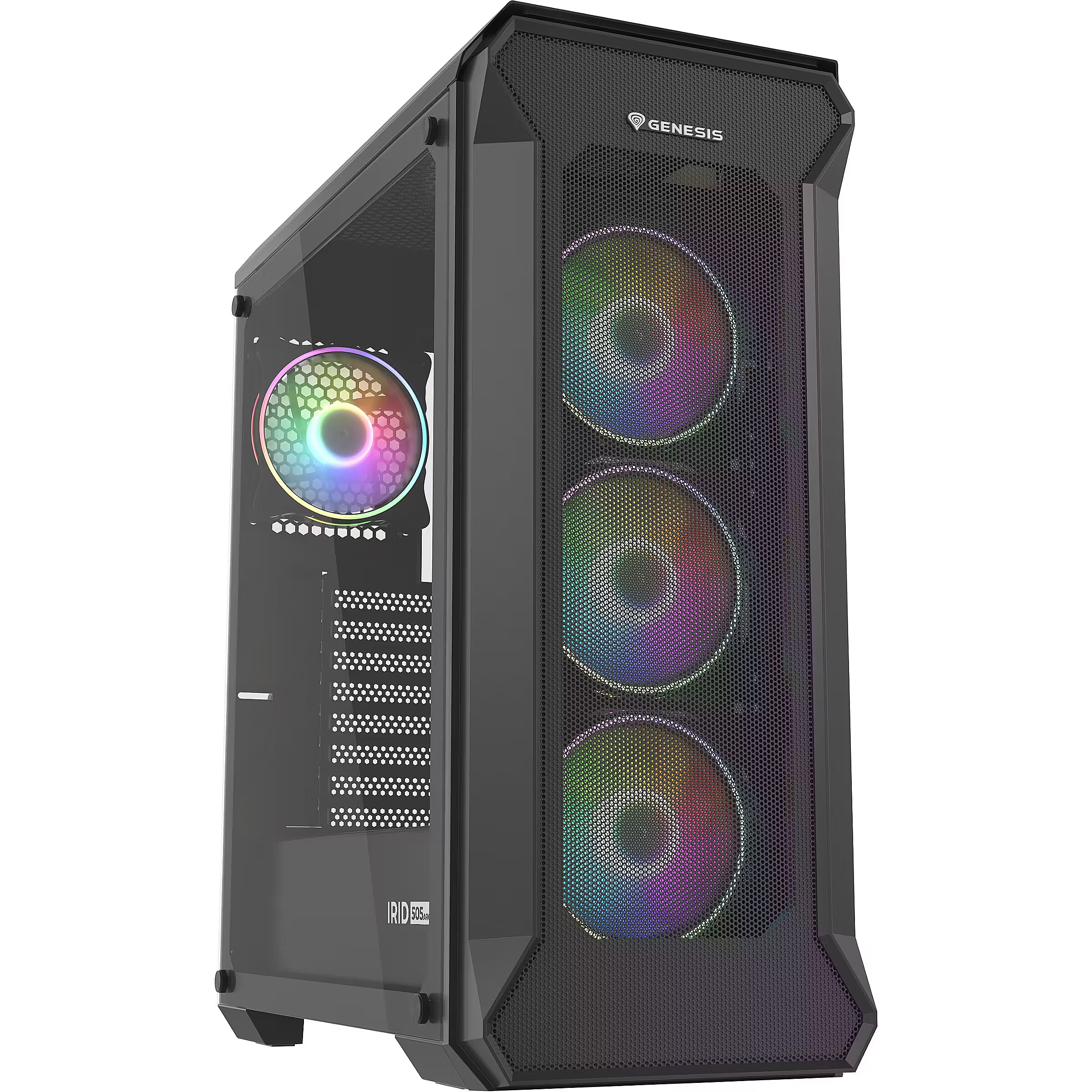LongSummaryDescription - GENESIS Irid 505 ARGB. Form factor: Midi Tower, Type: PC, Product colour: Black, Transparent. Power supply location: Bottom. Front fans installed: 3x 120 mm, Front fans diameters supported: 120,140 mm, Rear fans installed: 1x 120 mm. Supported HDD sizes: 2.5,3.5". Width: 220 mm, Depth: 447 mm, Height: 510 mm