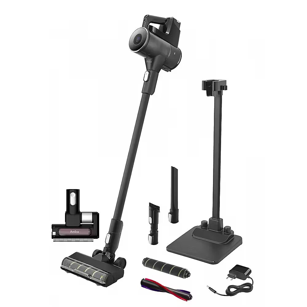 Accessories included - Ładowarka Wałek do podłóg twardych Mała szczotka 2 w 1 Stojak do przechowywania odkurzacza z akcesoriami Szczotka do parkietu Ssawka do szczelin Miniturboszczotka