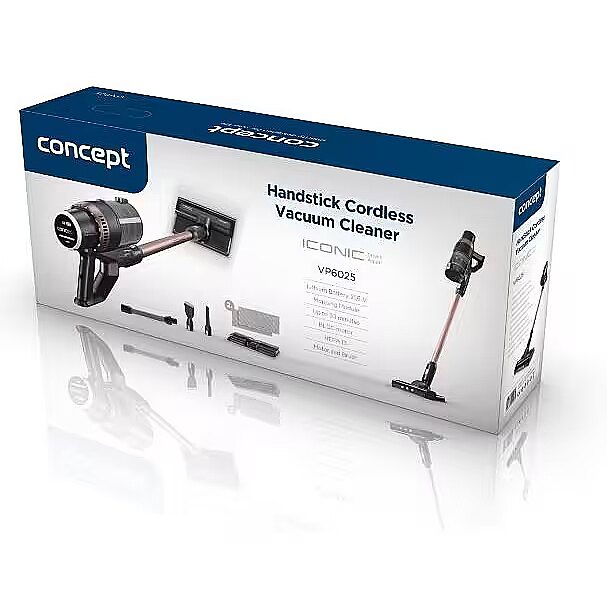 Description - An upright vacuum cleaner, a handheld vacuum cleaner and a mop in one Are you looking for a vacuum cleaner that will not take up too much space and will always be at hand for quick cleaning? The Iconic Smart Aqua Concept VP6025 3-in-1 upright vacuum cleaner is an obvious choice. It is a combination of an upright vacuum cleaner and a mop. You can use it to vacuum, mop or combine the two together and reduce your cleaning time. Perfect for all types of floors. For minor cleaning, you can use the removable hand unit, which you can fully use not only at home, but also for cleaning your car. Extremely light A huge advantage of the VP6025 vertical vacuum cleaner is its weight of only 2.3 kg. Thanks to its lightweight design, ergonomic handle and movable joint, it is very easy to use. It vacuums and mops in one go, so cleaning takes less time With the VP6025 upright vacuum cleaner, you can vacuum and mop all your floors in one go, so cleaning takes half the time. Just fill the tank with distilled water and place it on the turbo brush nozzle. The cleaning fabric can be easily removed and washed in the washing machine. The powerful BLDC motor increases the suction power of the vacuum cleaner High suction power is thanks to the BLDC motor. It is a brushless DC motor that has many advantages. It is quieter, more reliable, more energy efficient and has a longer life than conventional motors. The motorized nozzle increases vacuuming efficiency The vacuum cleaner works great not only on hard surfaces, but also on carpets. The floor nozzle of the vacuum cleaner is equipped with its own drive, which increases the suction power. This allows you to achieve very effective cleaning in a much shorter time. 3 operating modes with automatic regulation of suction power The vacuum cleaner has 3 modes: Low, Auto and High, which you can change depending on the type of surface being vacuumed directly on the vacuum cleaner handle. Low is suitable for hard floors, High for cleaning carpets. In Auto mode, the vacuum cleaner recognizes the degree of dirt and adjusts the suction power accordingly. LED lighting Thanks to the 3 LEDs that the VP6025 is equipped with, you won't miss a single spot. It will perfectly illuminate even the darkest places in the house, so you will always have perfect order everywhere. A handheld vacuum cleaner for minor cleaning at home and in the car The Iconic Smart Aqua Concept VP6025 3-in-1 upright vacuum cleaner has a removable hand unit, which you will especially appreciate when doing small cleaning work. Thanks to practical accessories in the form of a long and short crevice nozzle with a brush, you can clean the interior of the car, sofa, kitchen counter or even the keyboard. You can also use a flexible hose, thanks to which you can better reach every narrow and hard-to-reach place. With the long suction tube, you can conveniently vacuum up even cobwebs from the ceiling. A very practical accessory is a wall holder in which you can fit not only the vacuum cleaner, but also small accessories that you will always have at hand. Removable long-life battery The VP6025 vertical vacuum cleaner will give you complete freedom of movement. No cable will bother you while you work, so you can clean without restrictions. The vacuum cleaner body contains a removable Li-Ion battery with a capacity of 2500 mAh. You can clean for up to 30 minutes on a single charge. Full charging takes 3-4 hours. Fast and easy operation The dust container has a capacity of 0.6 l, and its cleaning is very quick and hygienic. After filling, simply press the button to empty the container. The vacuum cleaner is equipped with an effective HEPA 13 filter, which will be especially appreciated by allergy sufferers and families with small children. Thanks to the filter contamination sensor, you know exactly when it is necessary to replace it, so that the vacuum cleaner serves you long and reliably.