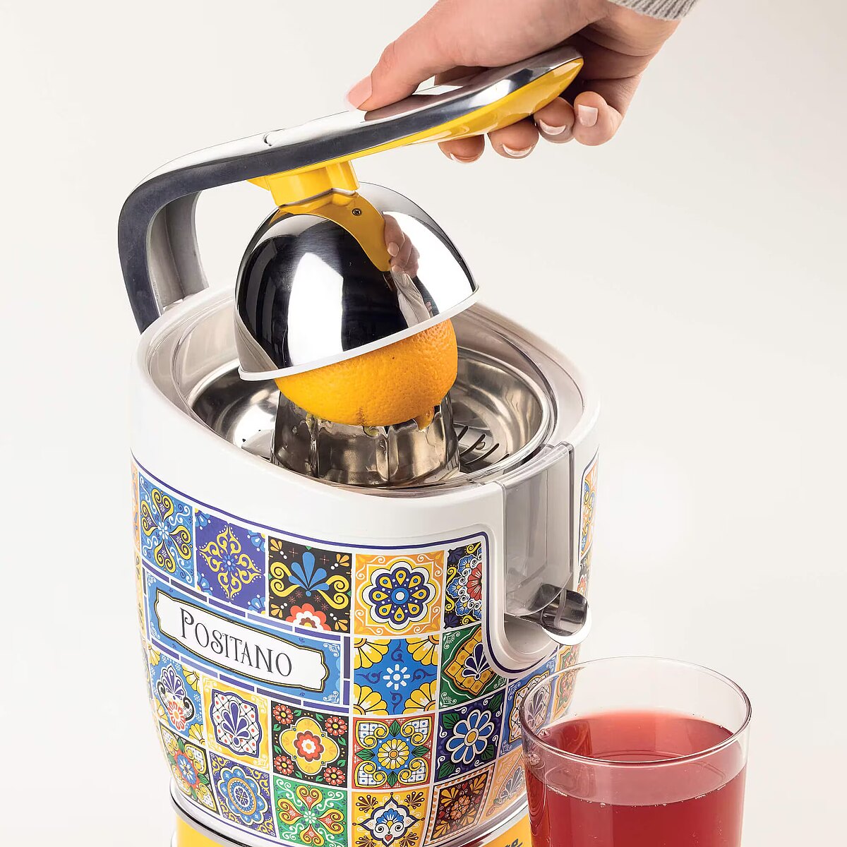 LongDesc - Refined design and cutting-edge functionality to transform your kitchen into an oasis of beauty, the Mediterranean charm of this line is inspired by the unique and vibrant style of the beautiful city of Positano.Powerful, quiet and with a refined design: the Positano Electric Juicer will add a brilliant style to your kitchen, evoking the essence of Positano with its metal body and chrome finishes.2 cones for large and small fruits will be supplied: the large stainless steel cone is ideal for oranges and grapefruits and the small cone with a pin can be used to conveniently hold smaller fruits such as lemons and limes. The professional juicer with pressure lever easily squeezes the fruit and ensures professional juicing. The stainless steel drip spout avoids juice from being wasted and ensures impeccable cleaning of the surfaces. An orange juice for breakfast is perfect to fill up on Vitamin C, minerals and energy!