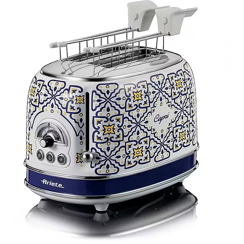 LongDesc - Refined design and cutting-edge functionality to transform your kitchen into an oasis of beauty, the Mediterranean charm of this line is inspired by the unique and vibrant style of the beautiful island of Capri. The electric toaster of the Capri line by Ariete toasts 4 slices of bread at the same time, without clamps, with 2 separate compartments and the possibility to choose the browning level and toasting of the bread that you prefer, thanks to the 6 levels that can be selected using the knob. Slices are automatically ejected once toasted, avoiding unpleasant burns, and the cold walls guarantee maximum safety during use. By toasting 2 slices of bread at the same time, you can quickly prepare toasted bread for your American breakfasts or brunches with friends, but that's not all: with Ariete’s Capri Toaster you can also activate the defrost function to defrost in a few moments and toast sandwiches and stuffed sandwiches, for tasty snacks or quick lunch breaks.