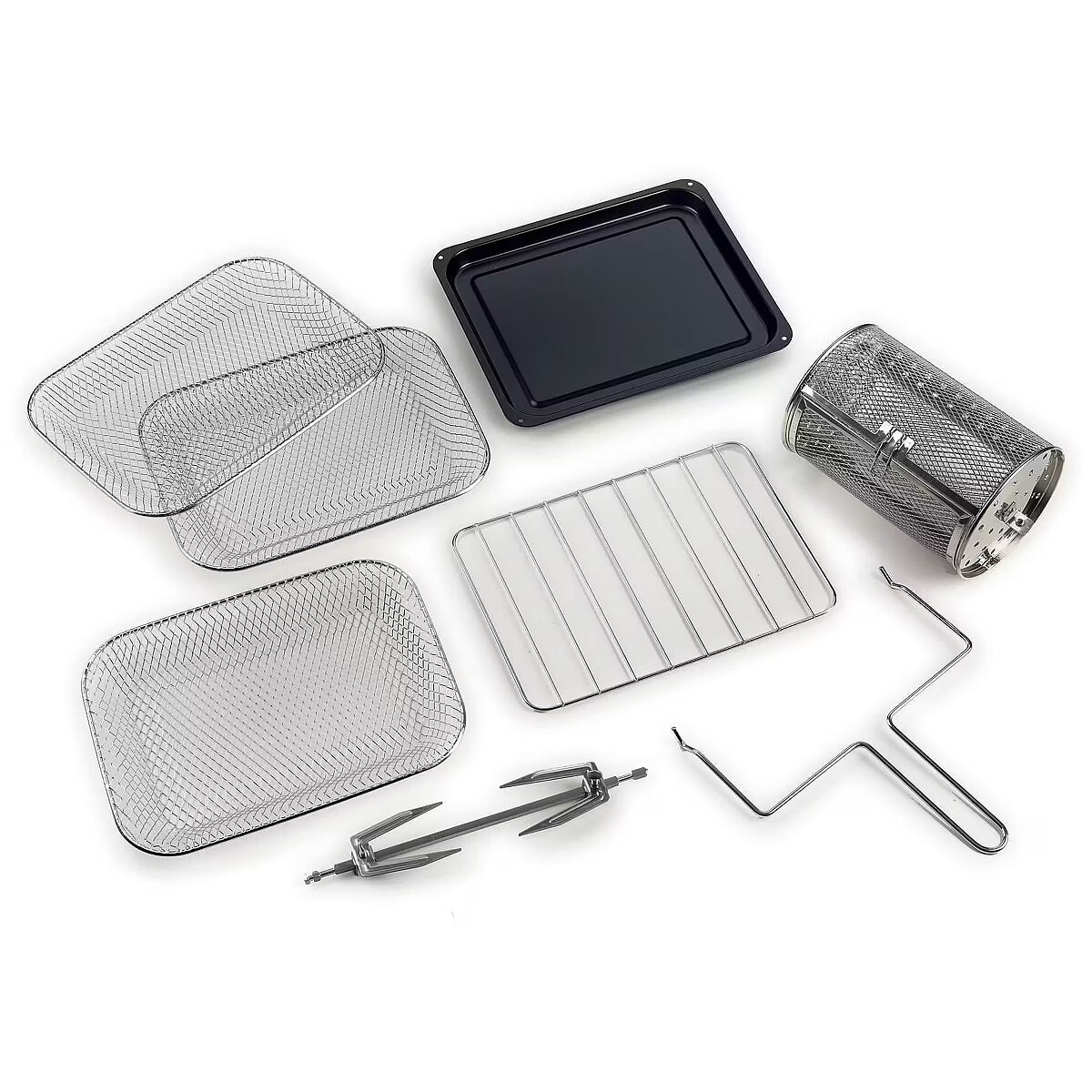 Packaging content - Accessories included - 3 cestelli forati in acciaio inox, cestello rotante in acciaio inox, griglia in acciaio inox, set girarrosto in acciaio inox e leccarda