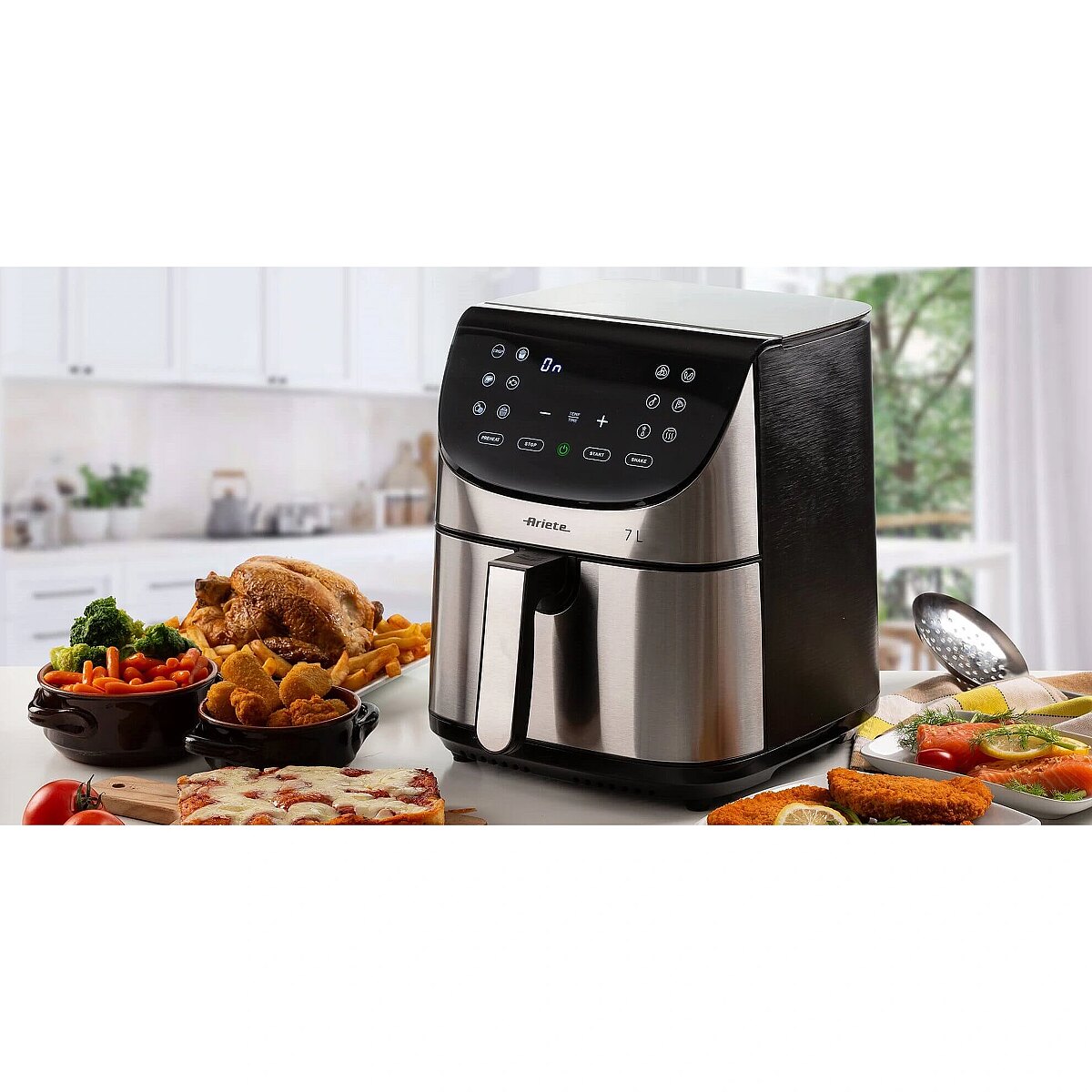 LongDesc - For large quantities of fried food and lots of crunchiness. Suitable for fried fish, meat, croquettes, chips and breaded foods. 12 pre-set programs ideal for dinners with family and friends.A lot of fried with a single spoonful of oil without giving up the crunchinessWith the Airy Fryer Metal 7L you can fry any dish in large quantities, using just a spoonful of oil to obtain healthy and tasty frying at the same time. Thanks to the large 7 L basket, with Ariete's Airy Fryer Metal 7L you can cook up to 2 kg of fries at once! French fries, but not only, also croquettes, fish, meat and many other breaded foods, both frozen and ready to fry, and fresh and freshly breaded, thanks to 12 pre-set programs.How does the air fryer work?The air fryer cooks thanks to the high temperature air, adjustable from 35°C up to 200°C, which circulates at maximum speed and 360° inside the cooking chamber and guarantees uniform distribution of heat inside. It is precisely the hot air that allows for homogeneous cooking of the dishes and the formation of a crunchy crust on the outside, which has nothing to envy to traditional frying. Thanks to the hot air, there will be no need to add a lot of oil to obtain tasty fried food, because a simple spoonful will suffice, in this way you will bring lighter but tasty food to the table for the whole family.From the large touch screen panel you can adjust cooking times, programs, temperatures and timers. Airy Fryer Metal 7L features the Max Crisp function: thanks to the special grid that positions the food raised inside the air chamber, the cooking of the food will be more crunchy in just a few minutes. Airy Fryer Metal 7L has 2 pluses: the heating function and the shake signal. The latter indicates when it is necessary to turn the dishes inside the basket in order to optimize cooking. Frying is right in your hands!The Airy Fryer Metal 7L air fryer is easy to clean thanks to the non-stick basket with grill and has a low environmental impact, because it does not produce waste oil, which is one of the most difficult to dispose of waste in circulation.
