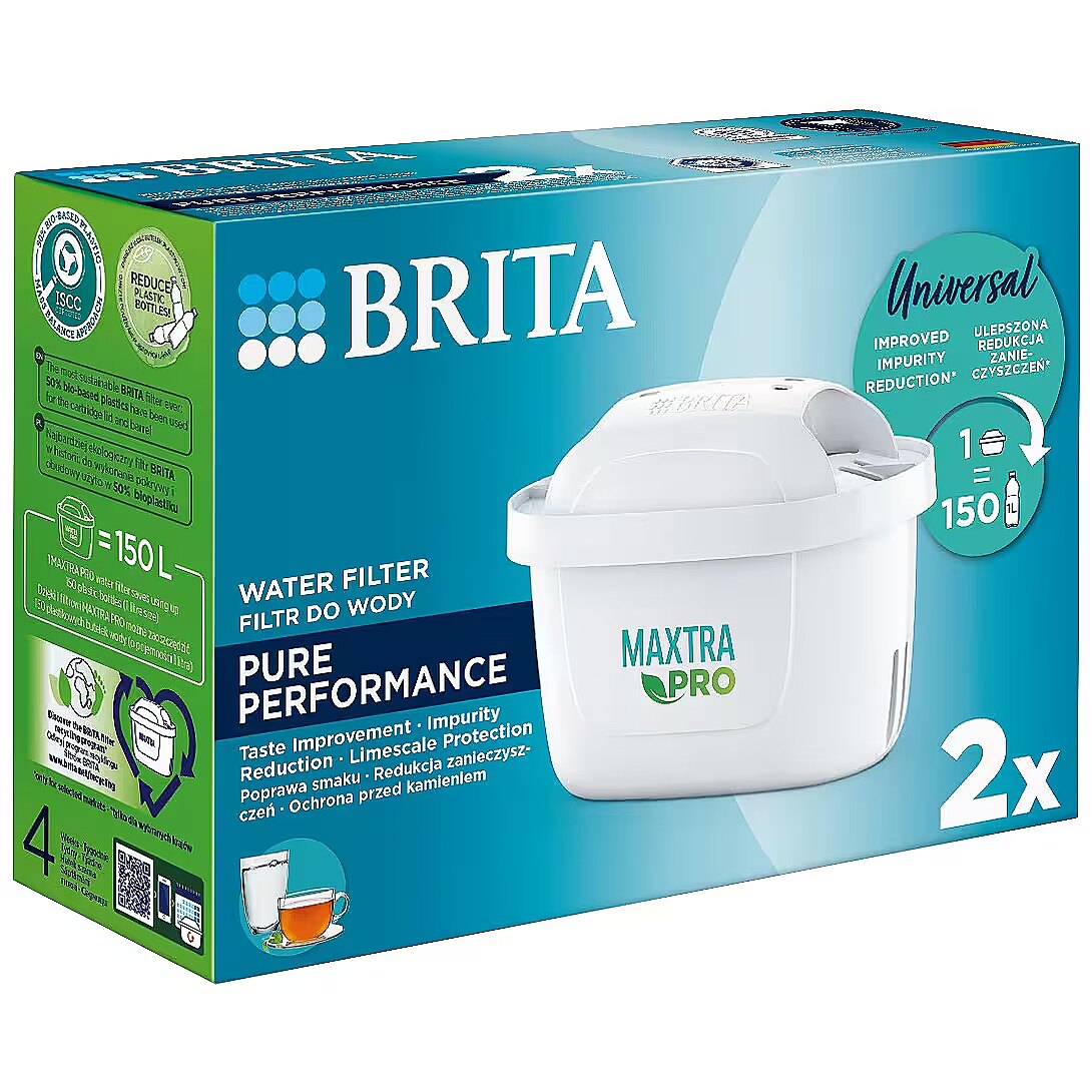 Description - Maxtra PRO Pure Performance replacement cartridge 2 pieces The perfect solution for cold water lovers BRITA MAXTRA PRO Pure Performance filter cartridges are designed mainly for filtering soft and medium-hard water. With this filter, you will forget about carrying heavy packs of bottled water. Filtered tap water is not only cleaner - it costs only a few groszy per liter! With them, taking care of proper hydration will become even easier! The BRITA MAXTRA PRO Pure Performance filter cartridge is cleaner water with an excellent taste, available whenever you want it. The water filter fits all BRITA jugs from the Aluna, Style, Marella, Elemaris, Flow series and the Glass glass jug. See how much you can gain thanks to the highest quality BRITA MAXTRA PRO Pure Performance cartridges: Cleaner, clearer water with a better taste. The perfect source of hydration for cold water lovers Big savings: a liter of filtered water costs only a few cents. Healthier and fresher water for up to 4 weeks with one filter, now the filter capacity is 150 l. Increased filtration capacity up to 150 l. 1 MAXTRA PRO filter replaces 150 disposable, plastic water bottles (with a capacity of 1 l). The most ecological filter in the history of BRITA. 50% bioplastic was used to make the cover and housing. Biological plastics are produced in whole or in part from renewable, biological sources such as plants. Only bioplastic is used, which has been certified by the internationally recognized organization ISCC PLUS. How does the BRITA MAXTRA PRO Pure Performance filter work? Filtration through the BRITA MAXTRA PRO Pure Performance is a 4-stage process: Super fine mesh: captures large particles from old water pipes, e.g. sand or rust. Natural activated carbon beads, made from coconuts, will prevent chlorine and its derivatives from getting into the filtered water, as well as trace contaminants such as herbicides, pesticides and pharmaceutical residues (if present in tap water) Ion exchanger beads reduce metals: e.g. lead and copper and soften water (hardness reduction has been tested up to 120 l). An additional high-efficiency filter mesh means 4x better impurity retention compared to the previous MAXTRA+ filter (particle size 30 micrometers) Safety included All BRITA products, including filter jugs, have received a positive Hygiene Certificate from the National Institute of Public Health and Hygiene. Thanks to the fact that they have been thoroughly tested, you can be sure that you are using safe water filters. BRITA MAXTRA PRO filters mean less plastic waste By choosing BRITA MAXTRA PRO filter jugs and cartridges, you are protecting our planet. By drinking filtered tap water, you are not only taking care of your health and the health of your family, but also reducing the amount of single-use plastic. Less plastic waste means more benefits for our environment. Give new life to used BRITA filters To protect the environment even better, BRITA Polska is running an innovative program, thanks to which used water filters can be recycled. This is another pro-ecological step in which you can participate - join the #RecyklingzBRITA club. Collect 6 used cartridges (BRITA MAXTRA+ or MicroDisc) and send them to BRITA Polska. You will not only receive a new cartridge in return, but you will also help protect our planet. You can learn more about this program at brita.pl Give BRITA filters a second life!