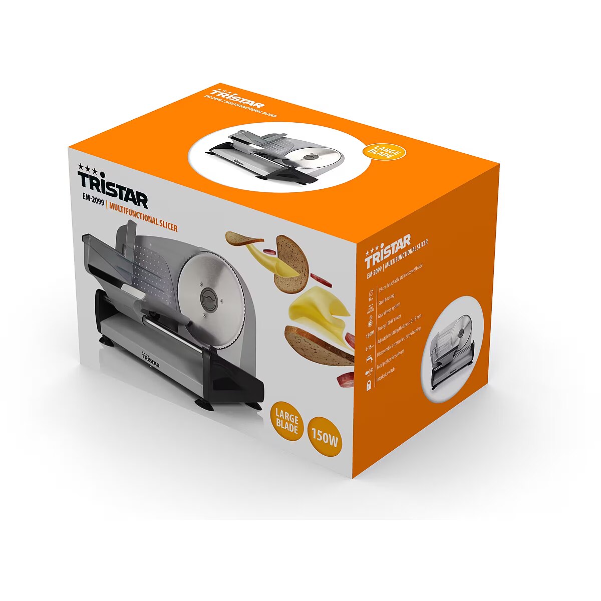LongDesc - EM-2099 Meat Slicer – 150 Watt – SteelThe durable and powerful EM-2099 Meat Slicer cuts any meat, cheese and bread with ease. Cut meat in thin slices or bread in thick slices for sandwiches by adjusting the thickness anywhere from 0 to 15 millimeters. All removable parts are dishwasher safe so cleaning the device is done in a jiffy.Stainless steel cutting bladeThe large cutting blade is made of high quality stainless steel and can be adjusted from 0 to 15 millimeters. You can slice meat and cheeses really thinly and make thick slices of bread or cake. The cutting board is optimally tilted in order for all foods to be pushed against the blade for easy cutting.Sturdy nonslip feetThe extra safe nonslip feet ensure the Meat Slicer stays put so you can safely slice all the food you want. Next to this, the meat slicer has a safety switch to stop the blade instantlyoffers you 24 months warranty on all productsWhat’s in the box:Meat Slicer, instruction manualReasons to choose the EM-2099 Meat Slicer:Durable and robust meat slicer for meat, cheese and breadStainless steel 19 cm cutting blade for effortless slicingAdjust the cutting thickness from 0 to 15 mm for thin and thick slicesSturdy nonslip feet for safe usage of the meat slicerEasy to clean thanks to the dishwasher safe parts
