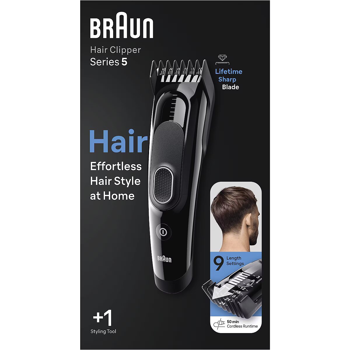 LongSummaryDescription - Braun Hairclipper 5 HC5310. Product colour: Black, Minimum hair length: 3 mm, Maximum hair length: 2.4 cm. Power source: Battery, Operating time: 50 min, Battery type: Built-in battery. Country of origin: China. Width: 137 mm, Depth: 57 mm, Height: 282 mm. Package width: 275 mm, Package depth: 190 mm, Package height: 113 mm