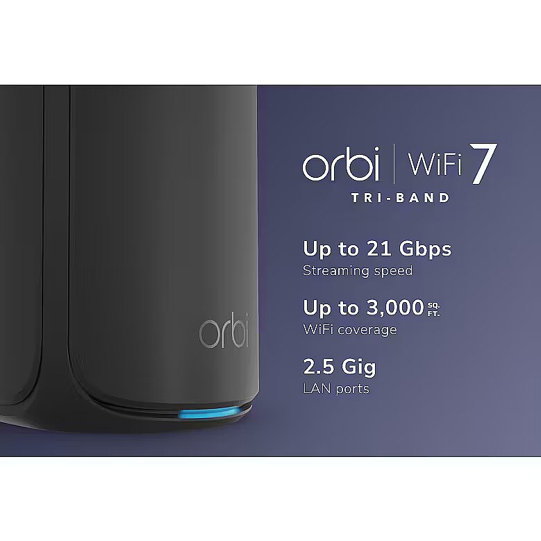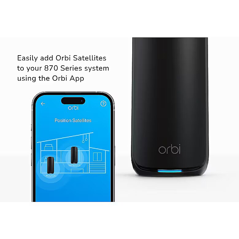 LongDesc - Expanding your Orbi™ system is as easy as the push of a button. Easily add 3,000 sq. ft. of additional WiFi 7 coverage to your existing Orbi 870 Series MeshUp to 21 Gbps speeds Speeds up to 21 Gbps† for unparalleled performance and coverage for your whole home, from the front door to the back garden and the basement to the loft​Tri-Band technology Tri-Band technology with Enhanced Backhaul ensures WiFi stays fast across all devices simultaneously​Expandable WiFi coverageEasily add 3,000 sq. ft. of additional WiFi 7 coverage to your existing Orbi 870 Series mesh system360° WiFi Coverage ​Elegant, new design and high-performance antennas provide exceptional 360° WiFi coverage across every corner of your home, no matter the layoutReimagined speed & reliability2.5 Gbps†† Ethernet ports unlock unbeatable speed and reliability for wired connections and 2.5 Gbps wired backhaul option​Easy Set Up​Simply power on Orbi satellite and set it up with the Orbi app​COVERAGE AREAConsider square footage beyond your home footprint to maximize performance and ensure coverage for outdoor areas.HOME SHAPEL or U-shaped homes may need additional satellites to extend WiFi around corners.WIRED CONNECTIONSOrbi satellites give your ultra-fast wired connections where you need them.CONSTRUCTION MATERIALSBrick and concrete weaken WiFi signals. Add-on satellites will strengthen WiFi coverage.Orbi works with any internet provider.From AT&TTM to Cox, Spectrum, Verizon, Xfinity®, and everything in between, there’s no need to worry about compatibility. Simply plug Orbi into your current modem and you’ll be enjoying whole-home WiFi in a few easy steps.Discover a superior class of WiFiBuilt on a quarter century of expertise, Orbi is fundamentally different WiFi, built for those who demand the best.