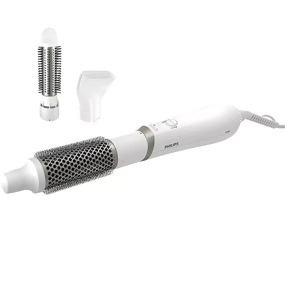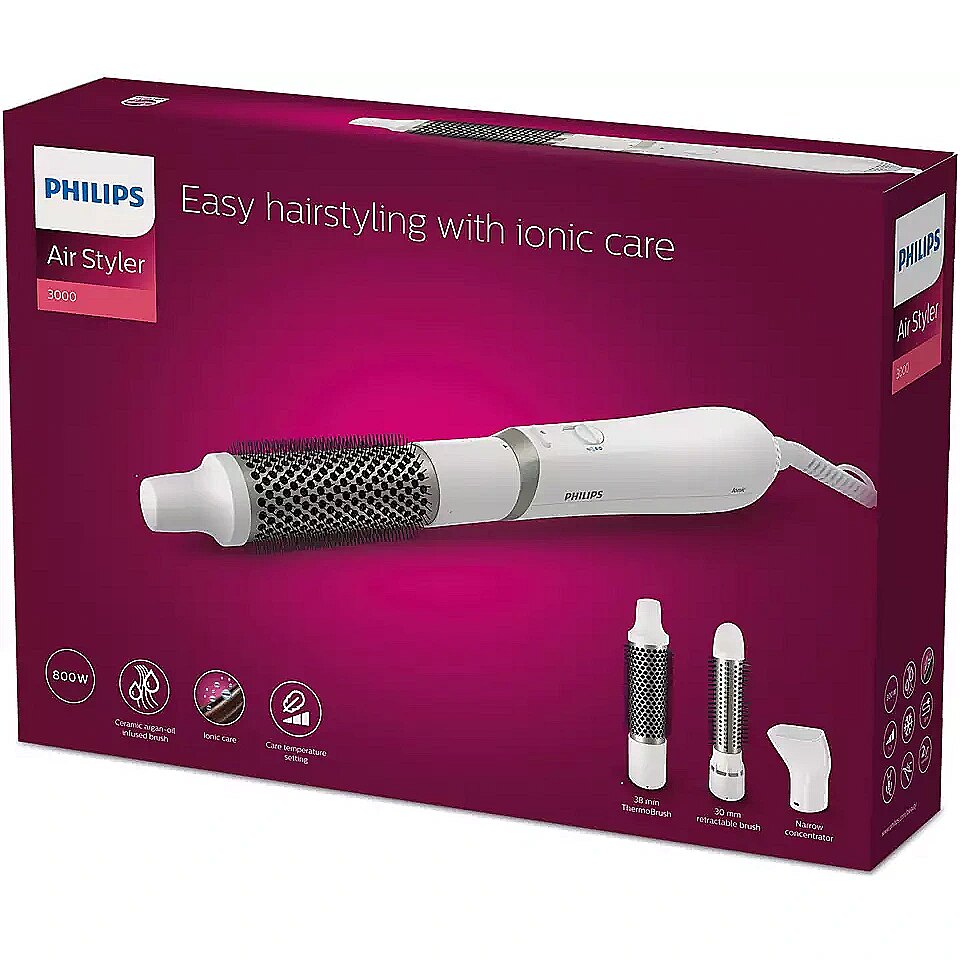 Description - Easy hair styling with ionic care Drying and styling at the same time, the Philips Air Styler 3000 Series allows you to create beautiful, natural hairstyles, provides your hair with incredible shine and ionic care. The 3 attachments are suitable for both long and short hair, making styling super easy. Comfortable use Cool air setting for gentle drying Perfectly styled hair 800 watts of power for beautiful styling results Three adjustable heat and speed settings provide simplified control 38mm diameter thermal brush for smooth hairstyles and waves Narrow concentrator provides an intensive blast of air 30mm diameter brush with extendable teeth to create defined waves Care and protect Care setting for enhanced protection during drying and styling Brush with argan oil Enhanced ionic care for straight and shiny hair