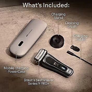 LongDesc - Braun’s best, better than ever before: Braun Series 9 PRO+ redefines electric shaving to ensure ultimate closeness, skin comfort and precision.No matter 1, 3, or 7-day beard: 5 perfectly synchronized shaving elements deliver exceptional efficiency and skin comfort, even on the longest & trickiest hair in every stroke.Ultimate precision even on tricky hair: Built-in precision ProTrimmer, enhanced with surgical-grade steel, gives maximum cutting efficiency even on moustache, sideburns and under nose.Premium accessory: Mobile charging PowerCase for up to 90min of shaving without recharging.Built to last for years: Series 9 PRO+ is 100% Made in Germany. 100% waterproof. Powerful Li-Ion battery. Use wet or dry.