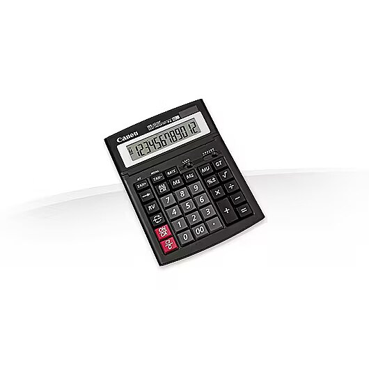 LongDesc - A 12-digit desktop calculator offering handy Tax Calculation functions and adjustable LCD display panel. With an 'IT-touch' keypad, dual power source and a professional black finish.12-digit desktop calculator with Tax functions and friendly IT-touch keypadComprehensive functions with Tax CalculationThe 12-digit WS-1210T calculator offers an extensive range of functions. Three Tax Calculation keys handle tax rates at a touch. A slide switch provides easy decimal point selection and rounding. The Grand Total memory automatically accumulates totals. Other convenient keys include Mark-up, Sign Change, Reverse and all the regular functions you'd expect from a Canon calculator.Adjustable LCD display panelA large and clear adjustable LCD display panel minimises glare and reflection. Simply tilt the panel for optimum legibility and comfort in any light conditions. Figures remain easy to read even after extended use.Friendly 'IT-touch' keypadCanon's spacious 'IT-touch' keypad ensures easy and efficient operation. The concept is based on a computer keyboard design for steady and accurate entries. Key roll over functionality allows speedy entry without keys blocking. Big colour-coded key tops are durably moulded to withstand heavy-duty use.Practical dual power sourceA battery and solar dual power source ensures reliable use anywhere and everywhere - whatever the light conditions.Smart and professional styleThis compact and lightweight black calculator has a smart and professional look. It's designed to fit neatly on your desk or shelf.