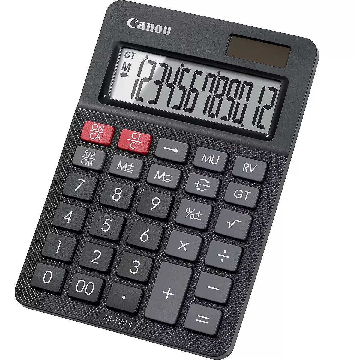 LongDesc - The AS-120 II is a desktop calculator with a 12-digit upright angled display. It also supports mark-up and reverse functions. The impressive grand total memory function means your complex calculations are made easy by saving up the subtotals after each calculation and computing the accumulated totals with a single touch. Some parts of the AS-120 II calculator have been manufactured from recycled Canon product material.