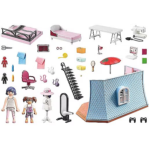 Accessories included - Figures: 1 Marinette, 1 Manon; Accessories: 1 loft with stairs and bed, 2 desks, 1 swivel chair, 2 controllers, 1 table lamp, 1 computer with keyboard, 1 sewing machine with pedal, 1 box, 2 boxes with lids, 2 pens, 2 hair ties, 1 standing mirror with table, 1 brush, 1 chaise longue with umbrella, 1 cushion, 2 hero dolls, 1 dress-up doll with wig and hat, 2 fabrics, 3 balls of thread, 1 tape measure, 1 pair of scissors